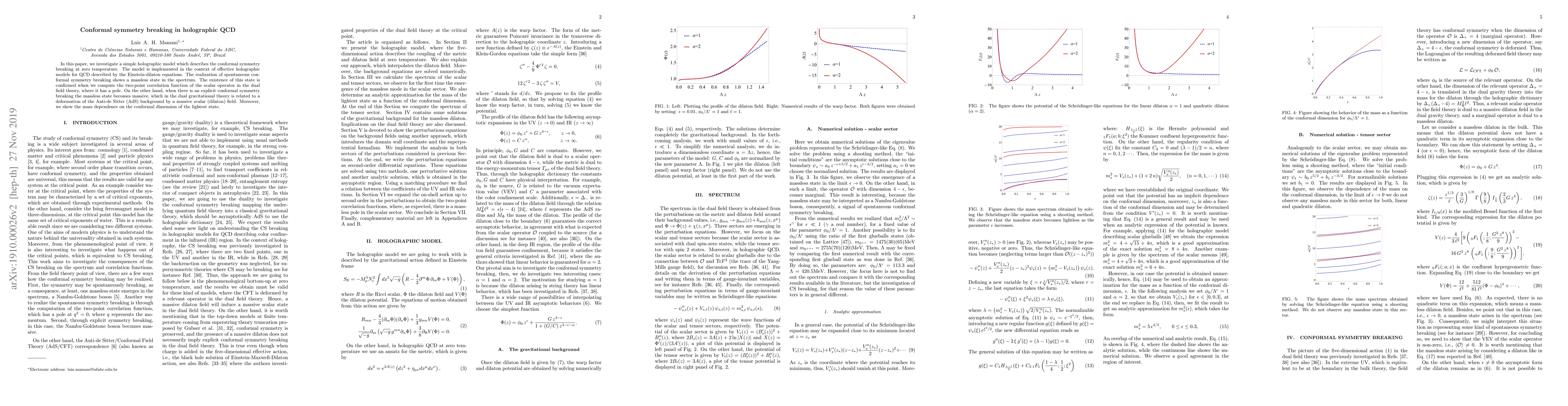 This paper explores a holographic model of conformal symmetry breaking at zero temperature in QCD, revealing a massless state from spontaneous breaking. The explicit breaking transforms this state into a massive one, linked to a deformation of the AdS background by a massive scalar field, showing a mass dependent on the conformal dimension.