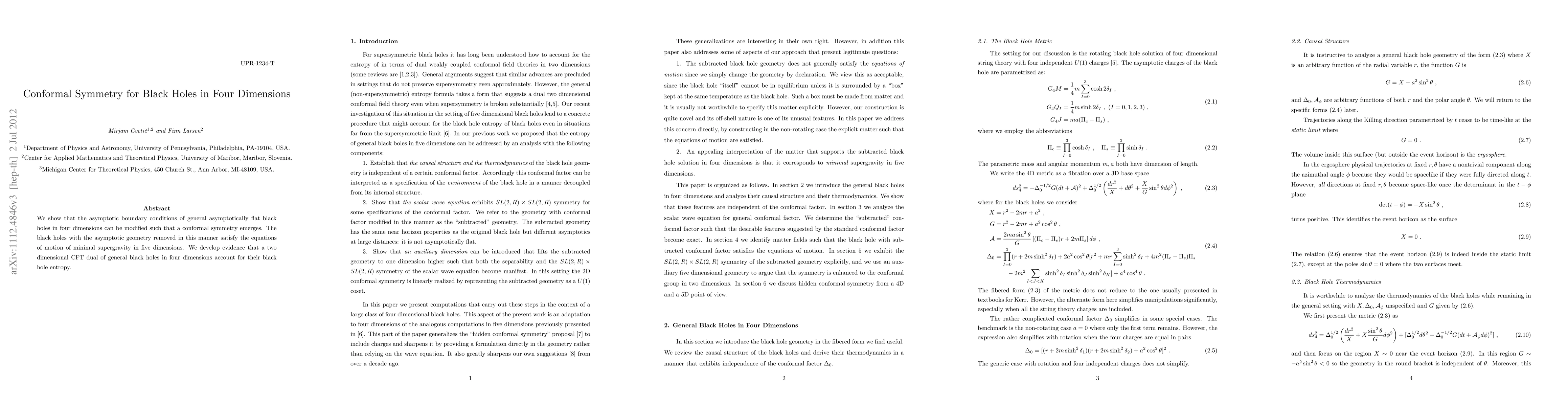 We show that the asymptotic boundary conditions of general asymptotically flat black holes in four dimensions can be modified such that a conformal symmetry emerges. The black holes with the asymptotic geometry removed in this manner satisfy the equations of motion of minimal supergravity in five dimensions. We develop evidence that a two dimensional CFT dual of general black holes in four dimensions account for their black hole entropy.
