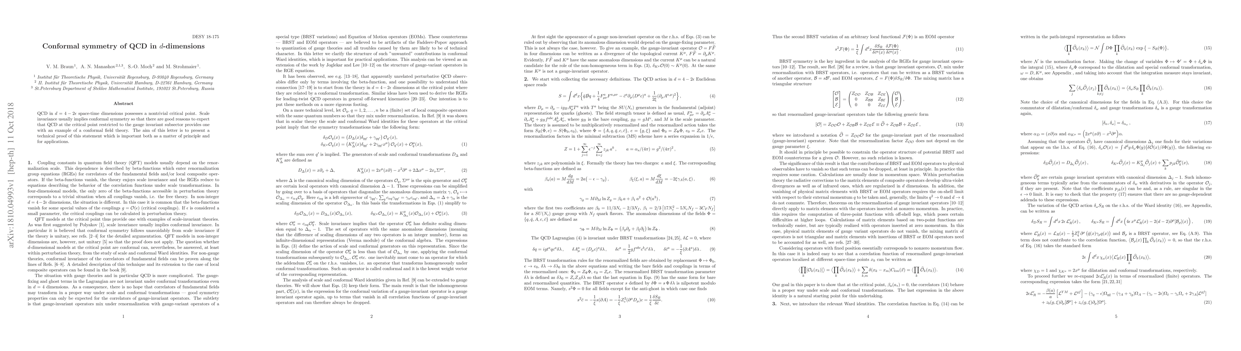 QCD in $d=4-2\epsilon$ space-time dimensions possesses a nontrivial critical point. Scale invariance usually implies conformal symmetry so that there are good reasons to expect that QCD at the critical point restricted to the gauge invariant subsector provides one with an example of a conformal field theory. The aim of this letter is to present a technical proof of this statement which is important both as a matter of principle and for applications.