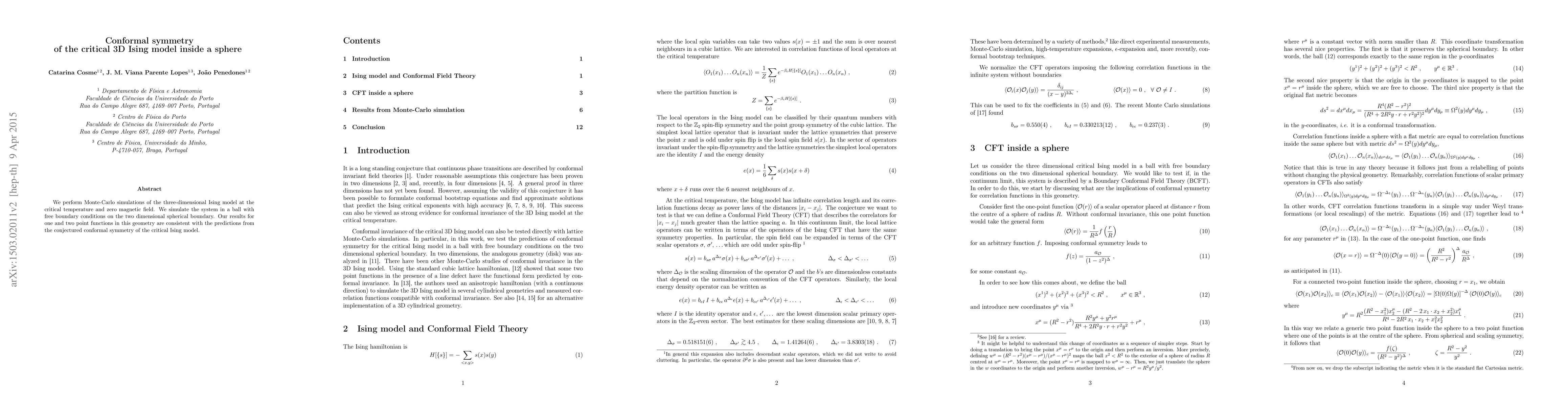 This study uses Monte-Carlo simulations to investigate the three-dimensional Ising model at its critical temperature within a sphere, confirming the conjectured conformal symmetry through consistent results for one and two point functions. The findings support the theoretical predictions of conformal symmetry in the critical Ising model.