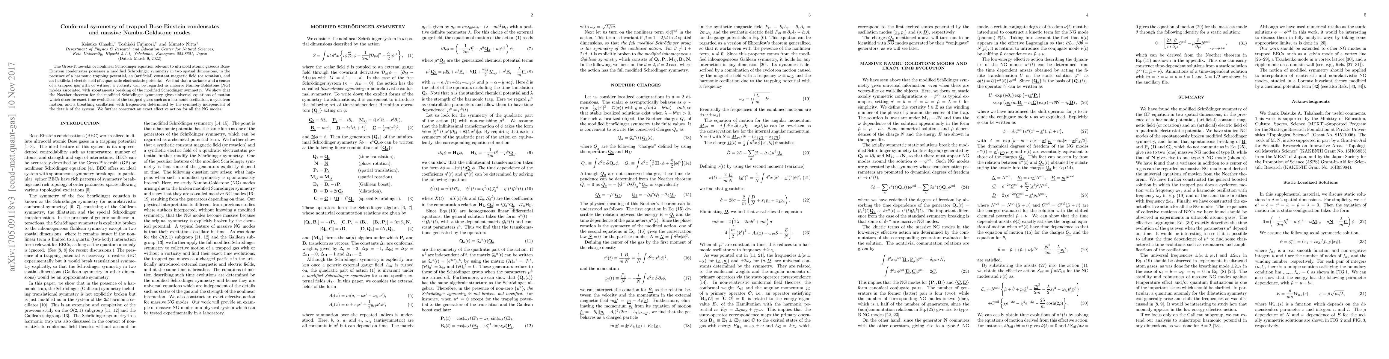 The Gross-Pitaevskii (GP) or nonlinear Schr\"odinger equation relevant to ultracold atomic gaseous Bose-Einstein condensates possess a modified Schr\"odinger symmetry in two spatial dimensions, in the presence of a harmonic trapping potential, an (artificial) constant magnetic field (or rotation) and an electric field of a quadratic electrostatic potential. We find that a variance and a center of a trapped gas with or without a vorticity can be regarded as massive Nambu-Goldstone (NG) modes associated with spontaneous breaking of the modified Schr\"odinger symmetry. We show that the Noether theorem for the modified Schr\"odinger symmetry gives universal equations of motion which describe exact time-evolutions of the trapped gases such as a harmonic oscillation, a cyclotron motion and a breathing oscillation with frequencies determined by the symmetry independently of the details of the system. We further construct an exact effective action for all the NG modes.