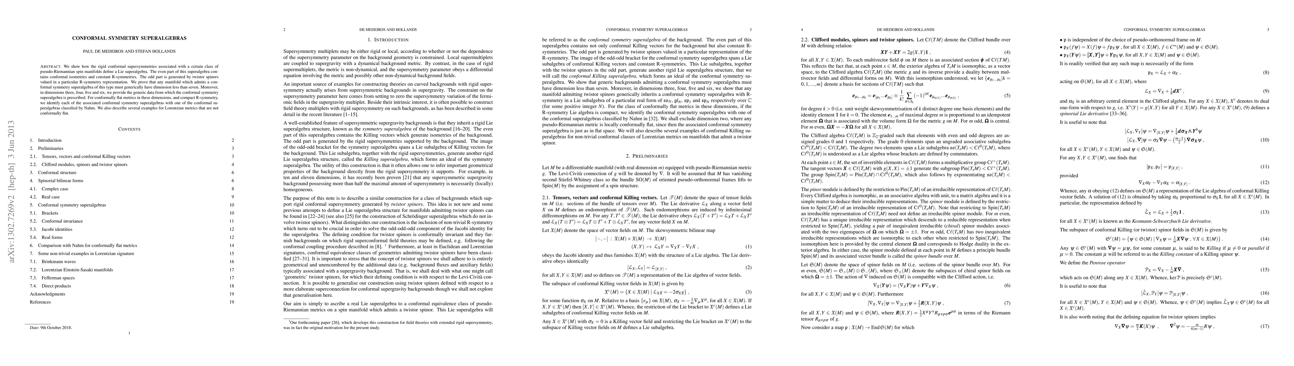 This paper demonstrates the construction of a Lie superalgebra from conformal symmetries on a class of pseudo-Riemannian spin manifolds, showing that such manifolds generally have dimensions less than seven. The superalgebra includes conformal isometries and R-symmetries, with its odd part generated by twistor spinors.