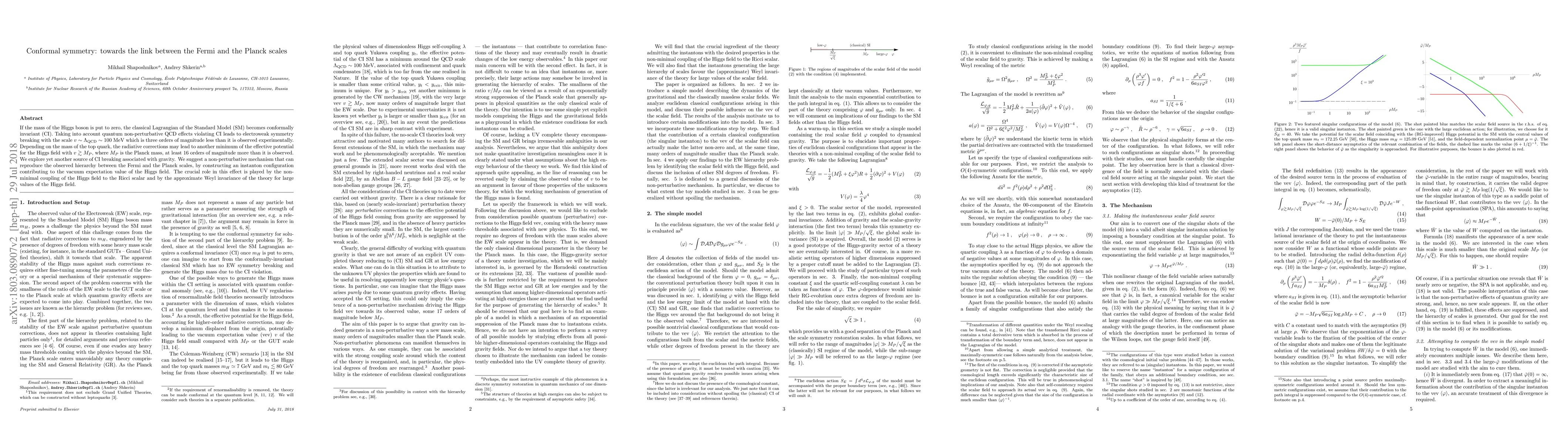 This paper investigates how conformal symmetry breaking in the Standard Model, influenced by quantum QCD effects and gravity, can explain the observed hierarchy between the Fermi and Planck scales. It proposes a non-perturbative mechanism involving the Higgs field's non-minimal coupling to the Ricci scalar and approximate Weyl invariance to bridge this vast scale difference.