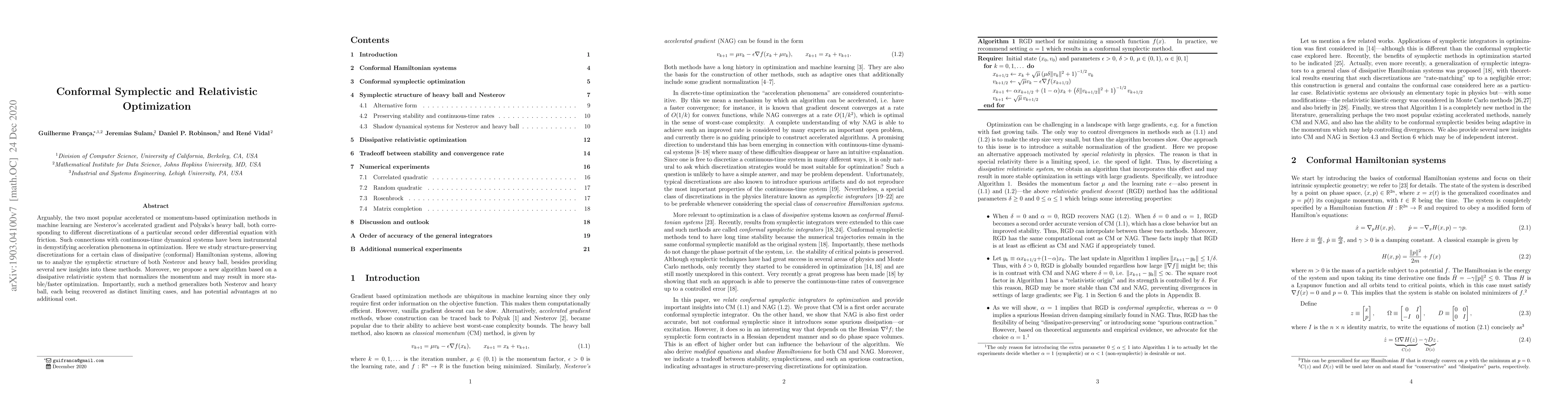 Arguably, the two most popular accelerated or momentum-based optimization methods in machine learning are Nesterov's accelerated gradient and Polyaks's heavy ball, both corresponding to different discretizations of a particular second order differential equation with friction. Such connections with continuous-time dynamical systems have been instrumental in demystifying acceleration phenomena in optimization. Here we study structure-preserving discretizations for a certain class of dissipative (conformal) Hamiltonian systems, allowing us to analyze the symplectic structure of both Nesterov and heavy ball, besides providing several new insights into these methods. Moreover, we propose a new algorithm based on a dissipative relativistic system that normalizes the momentum and may result in more stable/faster optimization. Importantly, such a method generalizes both Nesterov and heavy ball, each being recovered as distinct limiting cases, and has potential advantages at no additional cost.