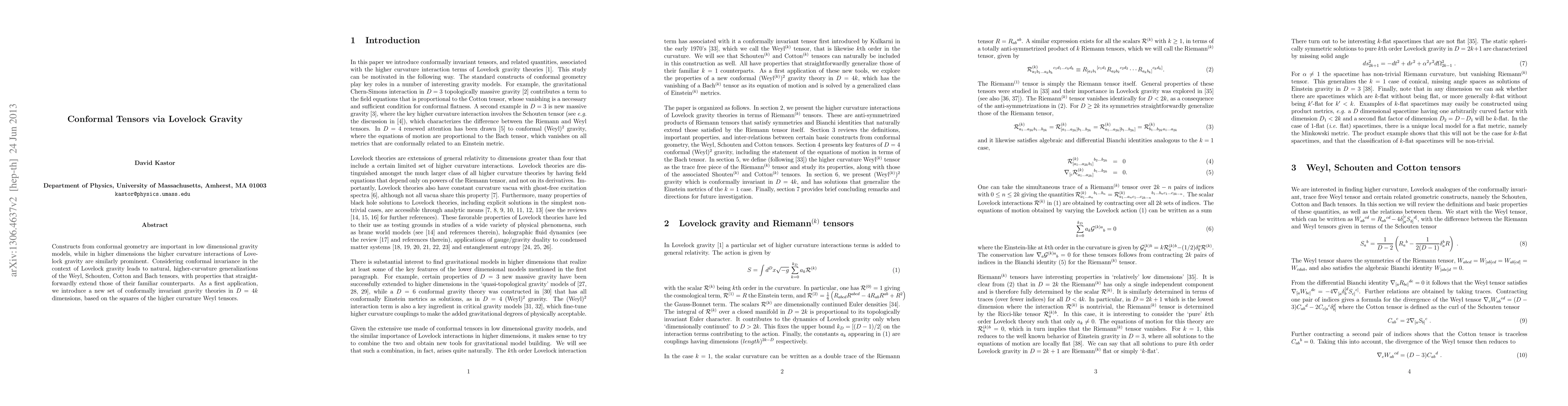 This paper explores conformal tensors within the framework of Lovelock gravity, deriving higher-curvature generalizations of the Weyl, Schouten, Cotton, and Bach tensors. It introduces a new set of conformally invariant gravity theories in dimensions D=4k, based on the squares of the higher curvature Weyl tensors.