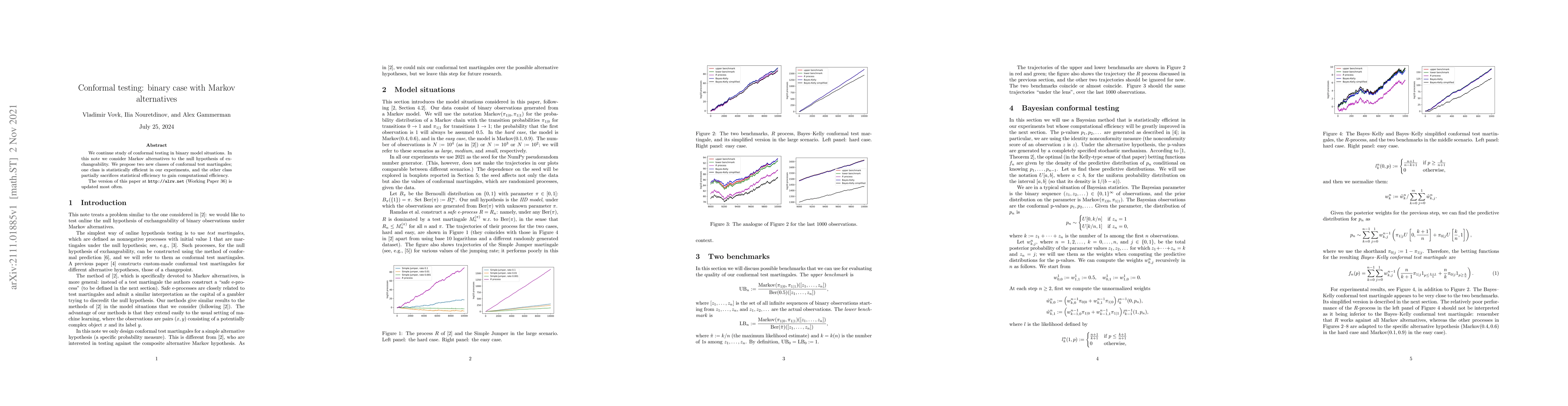 This paper explores conformal testing in binary models, focusing on Markov alternatives to the null hypothesis. It introduces two new classes of conformal test martingales, one that is statistically efficient and another that balances efficiency with computational speed.