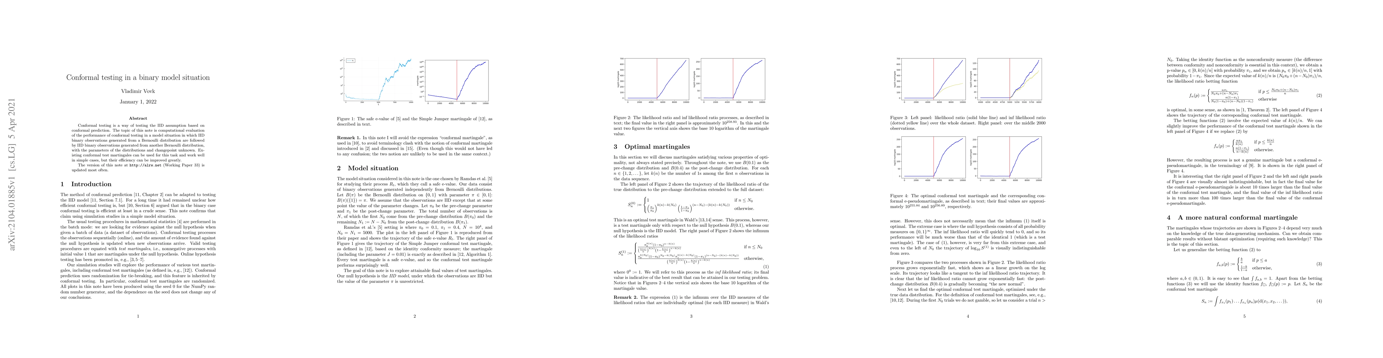 This paper evaluates the performance of conformal testing in a binary model scenario where observations follow two unknown Bernoulli distributions, with a focus on improving the efficiency of existing conformal test martingales. The study finds that while current methods work well in simple cases, significant enhancements are possible.