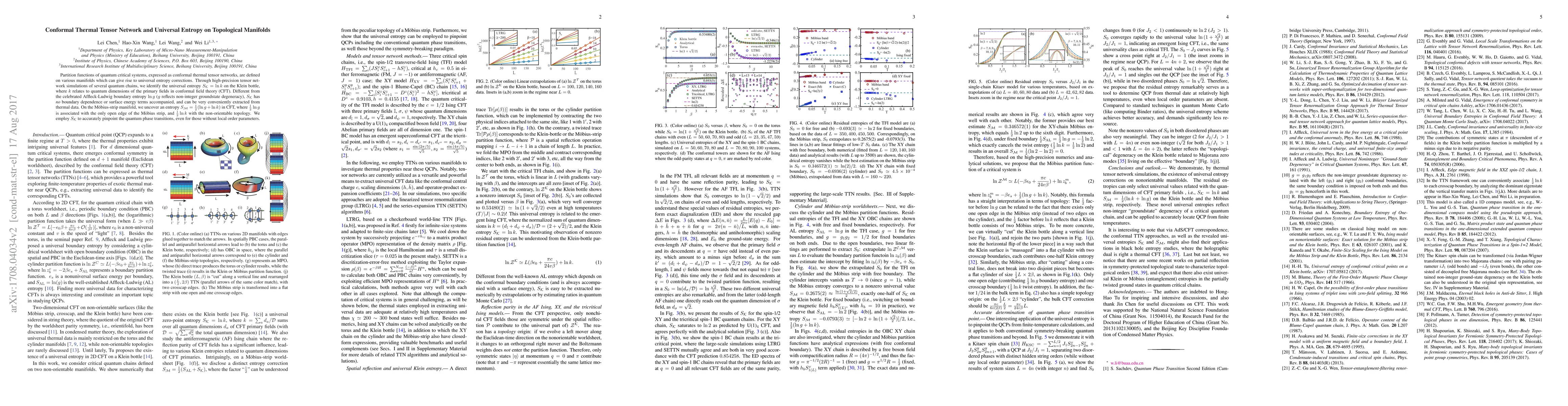 Partition functions of quantum critical systems, expressed as conformal thermal tensor networks, are defined on various manifolds which can give rise to universal entropy corrections. Through high-precision tensor network simulations of several quantum chains, we identify the universal entropy $S_{\mathcal{K}} = \ln{k}$ on the Klein bottle, where $k$ relates to quantum dimensions of the primary fields in conformal field theory (CFT). Different from the celebrated Affleck-Ludwig boundary entropy $\ln{g}$ ($g$ reflects non-integer groundstate degeneracy), $S_{\mathcal{K}}$ has \textit{no} boundary dependence or surface energy terms accompanied, and can be very conveniently extracted from thermal data. On the M\"obius-strip manifold, we uncover an entropy $S_{\mathcal{M}} = \frac{1}{2} (\ln{g} + \ln{k})$ in CFT, where $\frac{1}{2} \ln{g}$ is associated with the only open edge of the M\"obius strip, and $\frac{1}{2} \ln{k}$ with the non-orientable topology. We employ $S_{\mathcal{K}}$ to accurately pinpoint the quantum phase transitions, even for those without local order parameters.