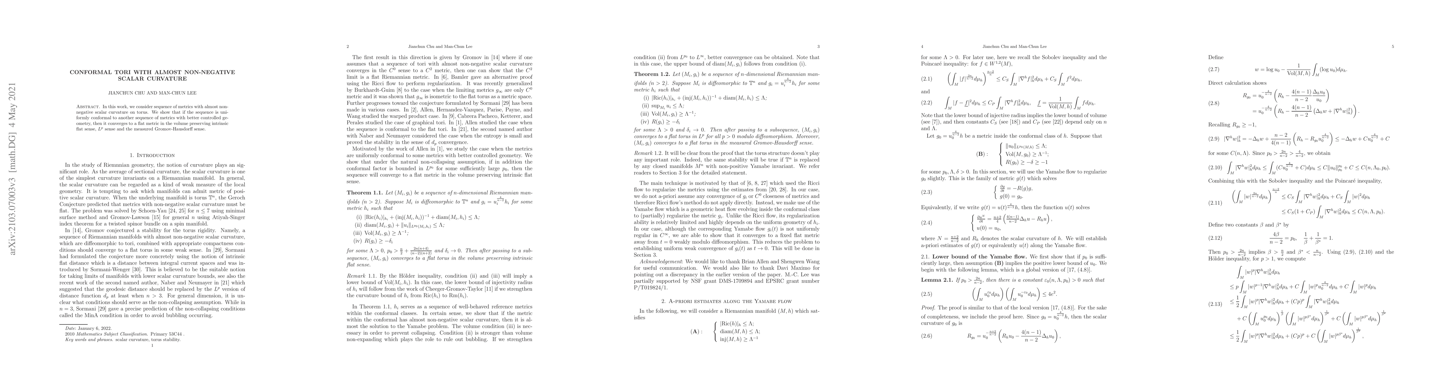 This paper demonstrates that a sequence of conformal metrics on tori with almost non-negative scalar curvature, uniformly conformal to metrics with controlled geometry, converges to a flat metric in volume-preserving intrinsic flat, $L^{p}$, and measured Gromov-Hausdorff senses.