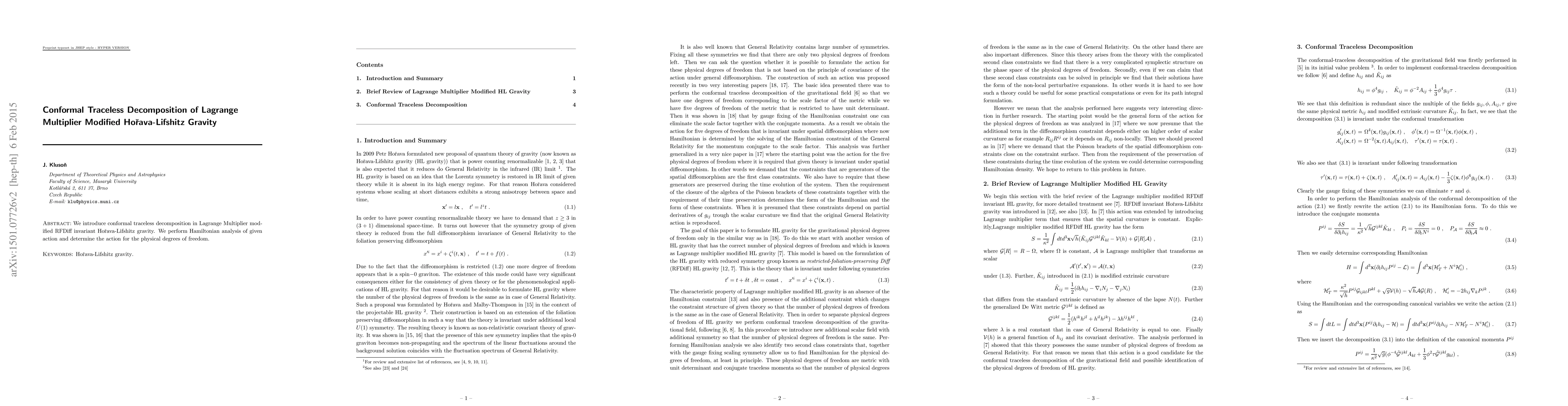 We introduce conformal traceless decomposition in Lagrange Multiplier modified RFDiff invariant Horava-Lifshitz gravity. We perform Hamiltonian analysis of given action and determine the action for the physical degrees of freedom.