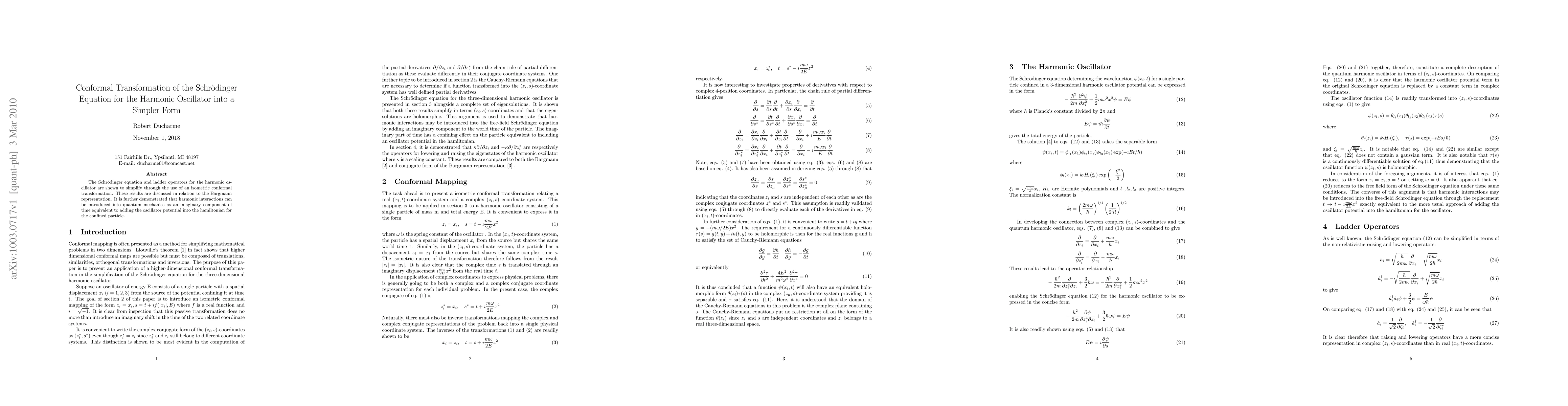 The paper demonstrates how an isometric conformal transformation simplifies the Schrödinger equation for the harmonic oscillator, linking these results to the Bargmann representation and introducing harmonic interactions as an imaginary time component.