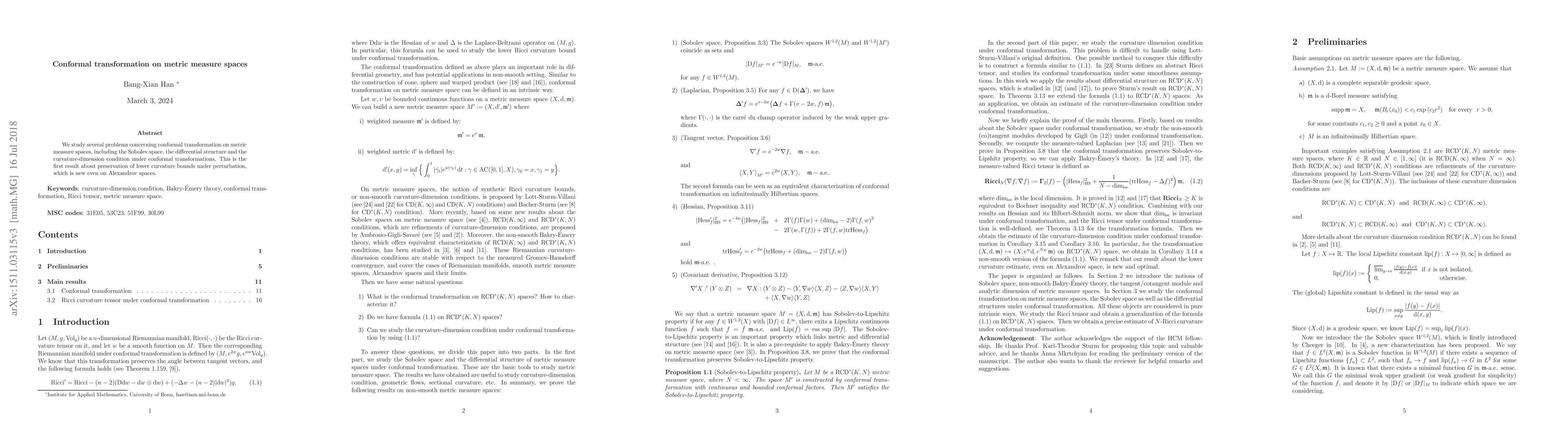 Summary: This paper investigates conformal transformations on metric measure spaces, focusing on the preservation of Sobolev spaces, differential structures, and lower curvature bounds, presenting novel results on the maintenance of lower curvature bounds under perturbations, even in Alexandrov spaces.
