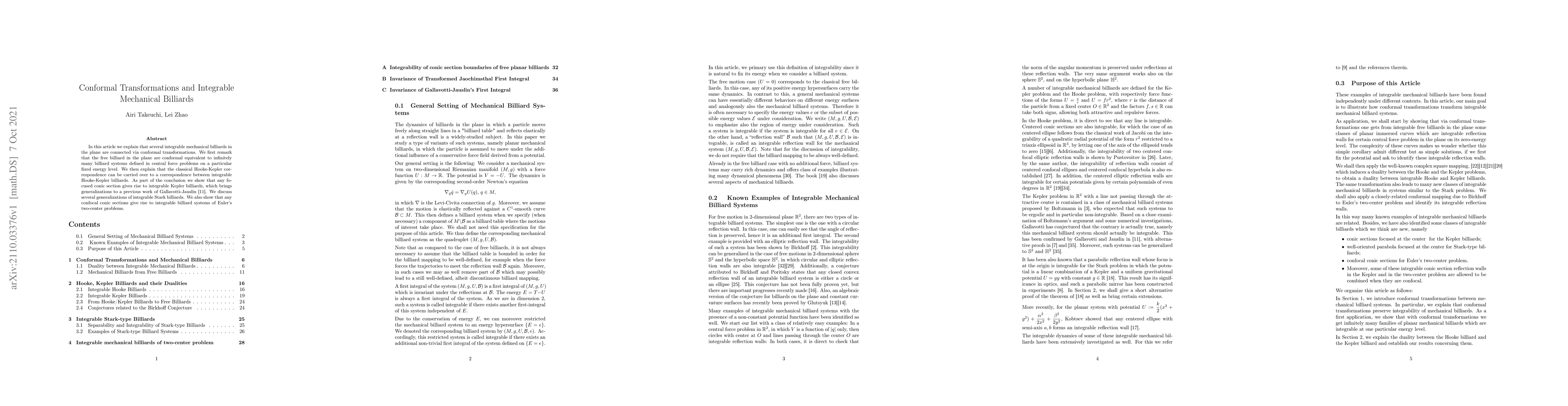 This paper demonstrates that various integrable mechanical billiards in the plane are linked through conformal transformations, showing equivalence between free plane billiards and central force problems at a fixed energy level. It also extends the Hooke-Kepler correspondence to integrable Hooke-Kepler billiards and generalizes integrable Stark billiards, concluding that focused conic sections yield integrable Kepler billiards.