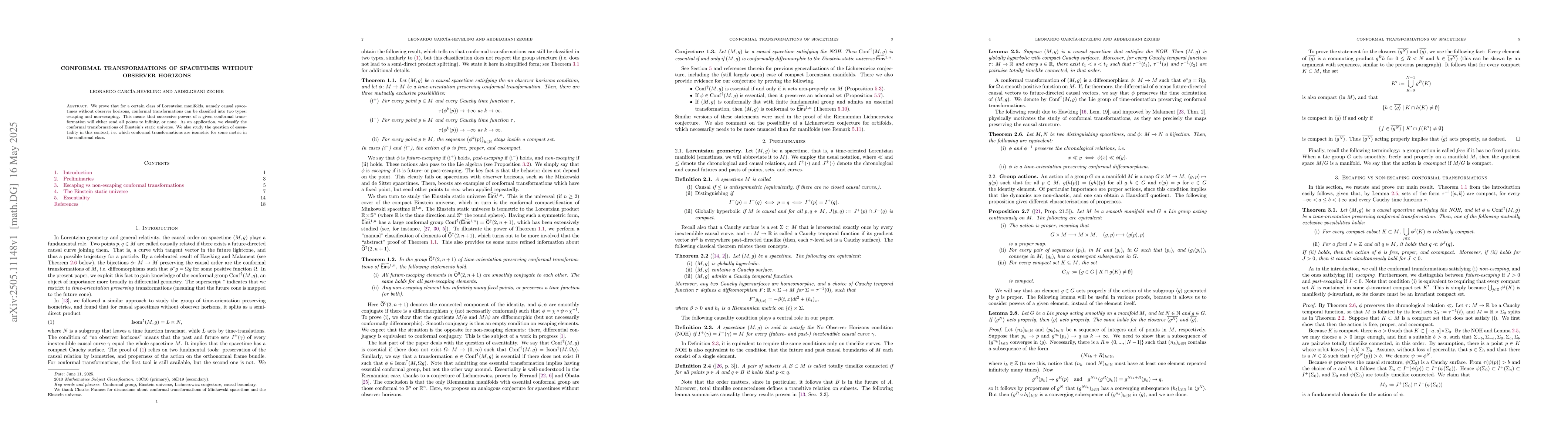 The research employs mathematical proof techniques to classify conformal transformations of Lorentzian manifolds without observer horizons.