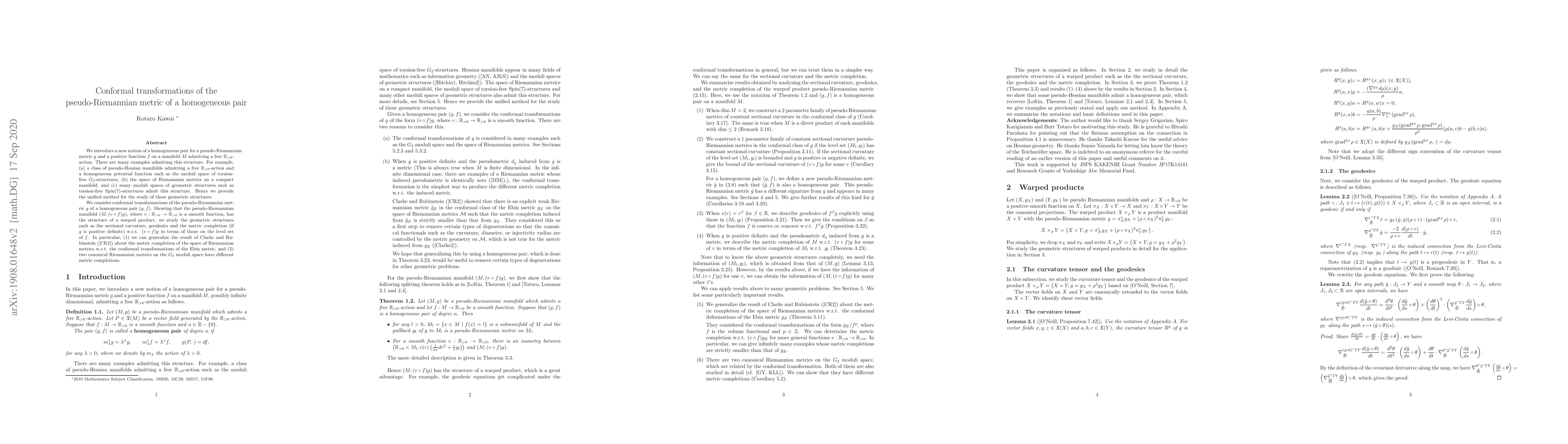 We introduce a new notion of a homogeneous pair for a pseudo-Riemannian metric $g$ and a positive function $f$ on a manifold $M$ admitting a free $\mathbb{R}_{>0}$-action. There are many examples admitting this structure. For example, (a) a class of pseudo-Hessian manifolds admitting a free $\mathbb{R}_{>0}$-action and a homogeneous potential function such as the moduli space of torsion-free $G_2$-structures, (b) the space of Riemannian metrics on a compact manifold, and (c) many moduli spaces of geometric structures such as torsion-free ${\rm Spin}(7)$-structures admit this structure. Hence we provide the unified method for the study of these geometric structures. We consider conformal transformations of the pseudo-Riemannian metric $g$ of a homogeneous pair $(g, f)$. Showing that the pseudo-Riemannian manifold $(M, (v \circ f) g)$, where $v: \mathbb{R}_{>0} \rightarrow \mathbb{R}_{>0}$ is a smooth function, has the structure of a warped product, we study the geometric structures such as the sectional curvature, geodesics and the metric completion (if $g$ is positive definite) w.r.t. $(v \circ f) g$ in terms of those on the level set of $f$. In particular, (1) we can generalize the result of Clarke and Rubinstein about the metric completion of the space of Riemannian metrics w.r.t. the conformal transformations of the Ebin metric, and (2) two canonical Riemannian metrics on the $G_2$ moduli space have different metric completions.
