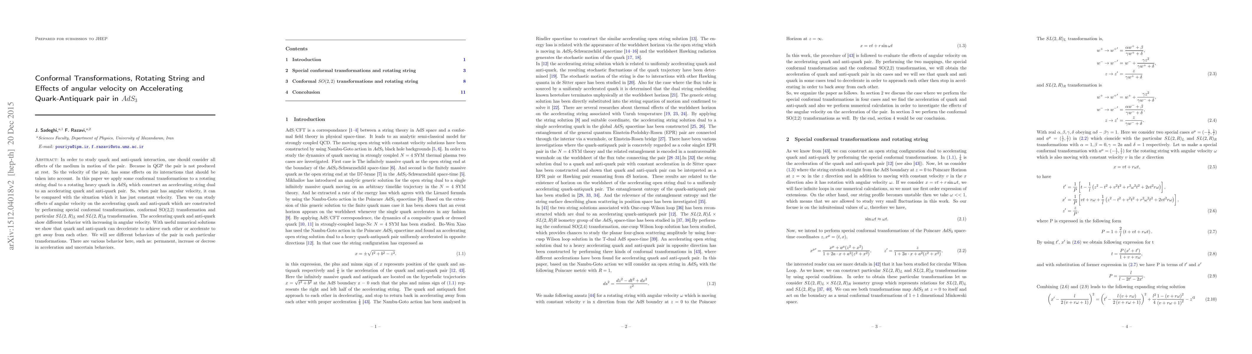 In order to study quark and anti-quark interaction, one should consider all effects of the medium in motion of the pair. Because the pair, is not produced at rest in QGP. So the velocity of the pair, has some effects on its interactions that should be taken into account. In this paper we apply some conformal transformations for a rotat- ing string dual to a rotating heavy quark in $AdS_3$ which construct an accelerating string dual to an accelerating quark and anti-quark pair. So, we can have a comparison between when pair has angular velocity or not. Then we can study effects of angular velocity on the accelerating quark and anti-quark which are constructed by performing special con- formal transformations, conformal SO(2,2) transformation and particular $SL(2,R)_L$ and $SL(2,R)_R$ transformation. The accelerating quark and anti-quark show different behavior with increasing in angular velocity. With useful numerical solutions we show that quark and anti-quark can deccelerate to achieve each other or accelerate to get away from each other. We will see variable behaviors of the pair in different transformations. There are various behavior like, permanent behavior, increase or decrese in acceleration or we will consider uncertain behavior.