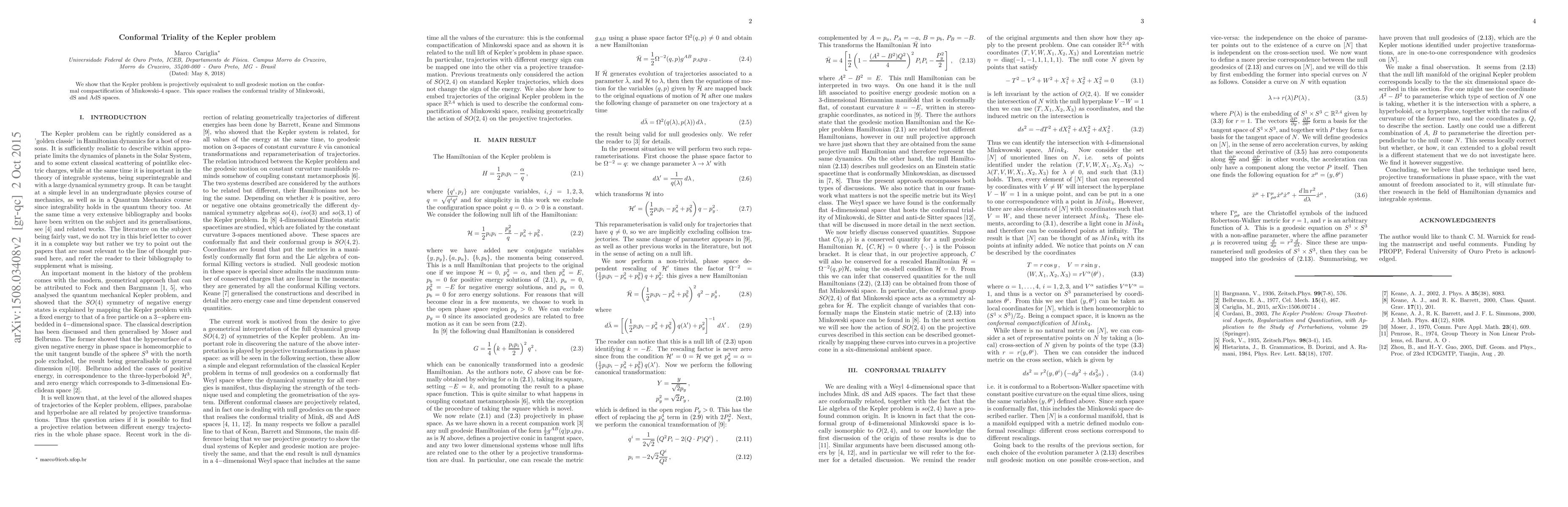 The research paper demonstrates that the Kepler problem can be likened to movement along null geodesics in the conformal compactification of Minkowski-4 space, revealing a conformal triality connecting Minkowski, de Sitter, and Anti-de Sitter spaces.