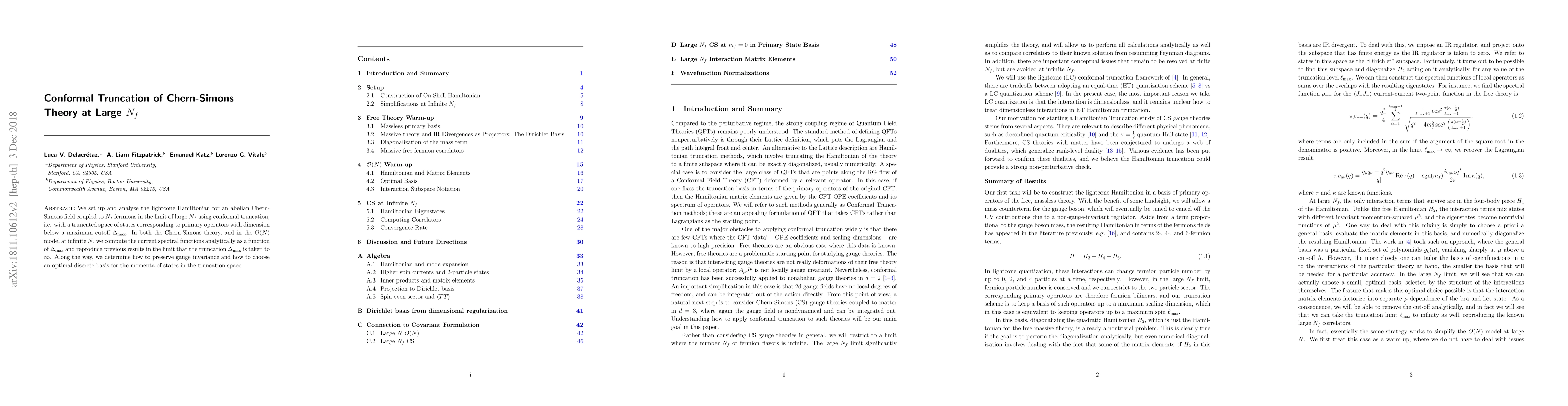 We set up and analyze the lightcone Hamiltonian for an abelian Chern-Simons field coupled to $N_f$ fermions in the limit of large $N_f$ using conformal truncation, i.e. with a truncated space of states corresponding to primary operators with dimension below a maximum cutoff $\Delta_{\rm max}$. In both the Chern-Simons theory, and in the $O(N)$ model at infinite $N$, we compute the current spectral functions analytically as a function of $\Delta_{\rm max}$ and reproduce previous results in the limit that the truncation $\Delta_{\rm max}$ is taken to $\infty$. Along the way, we determine how to preserve gauge invariance and how to choose an optimal discrete basis for the momenta of states in the truncation space.