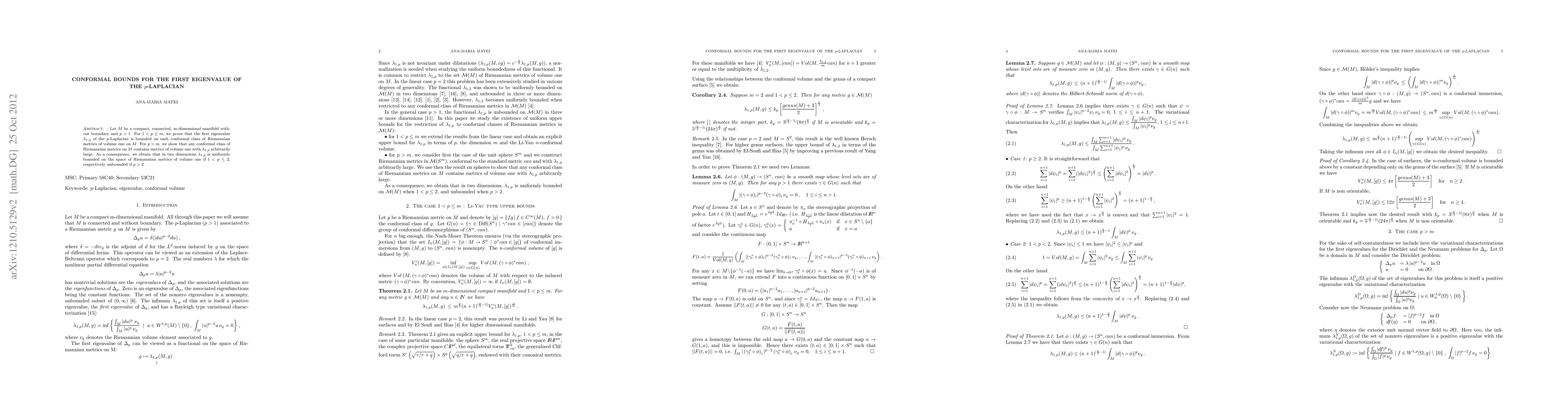 m, we show that any conformal class of Riemannian metrics on M contains metrics of volume one with \lambda_{1,p} arbitrarily large. As a consequence, we obtain that in two dimensions \lambda_{1,p} is uniformly bounded on the space of Riemannian metrics of volume one if 1