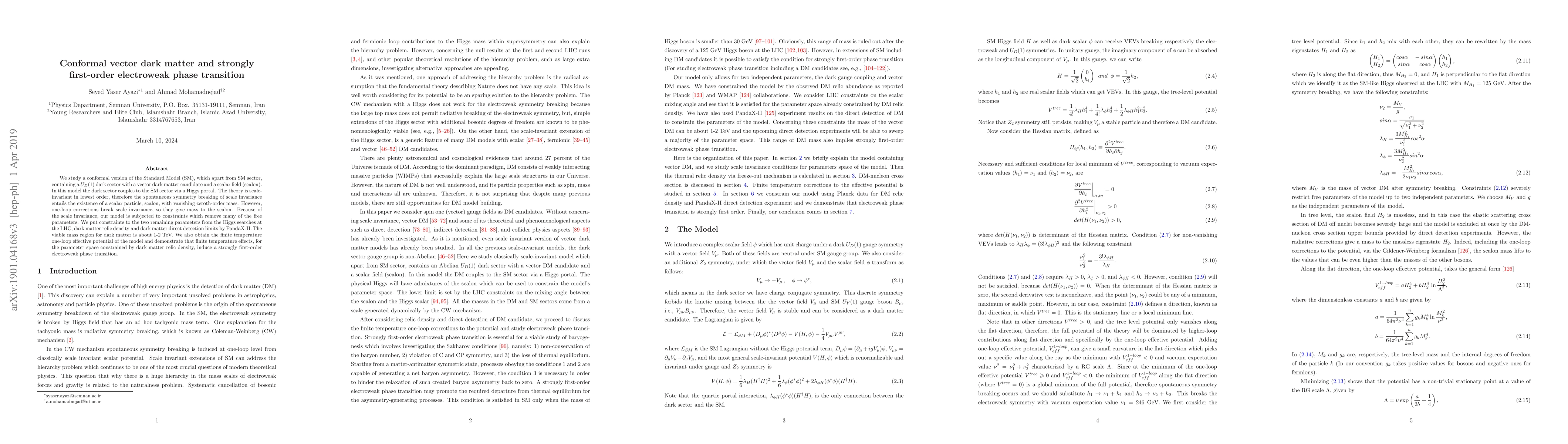 This paper explores a conformal version of the Standard Model with a $U_D(1)$ dark sector and a vector dark matter candidate, constrained by LHC Higgs searches and dark matter limits. It finds a strongly first-order electroweak phase transition at finite temperatures due to one-loop corrections breaking scale invariance.