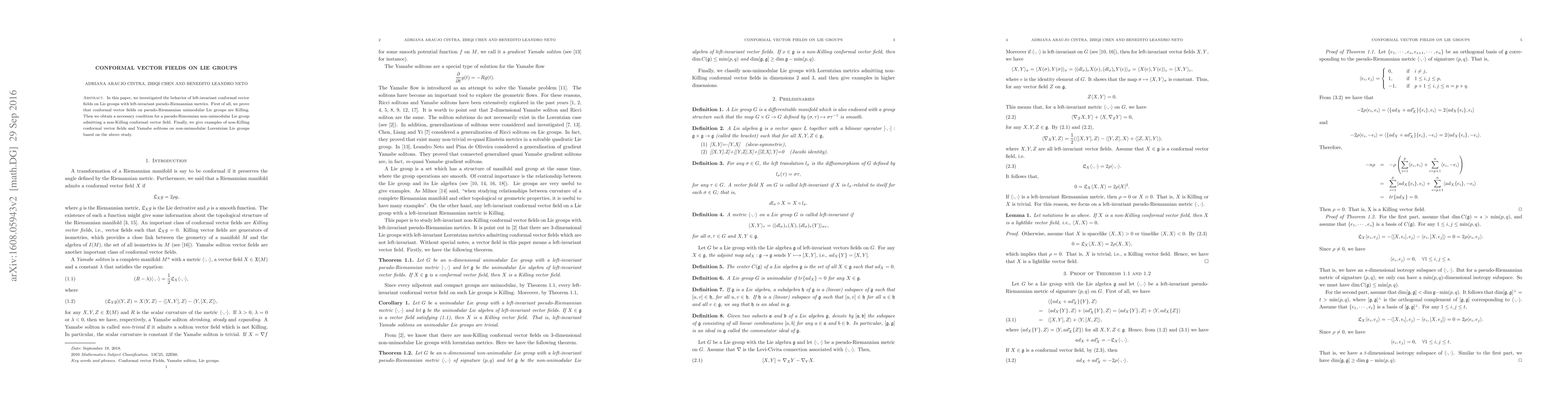 This paper explores left-invariant conformal vector fields on Lie groups with left-invariant pseudo-Riemannian metrics, proving that such fields are Killing on pseudo-Riemannian unimodular Lie groups and providing conditions for non-Killing fields in non-unimodular Lie groups, along with examples of such fields and Yamabe solitons.