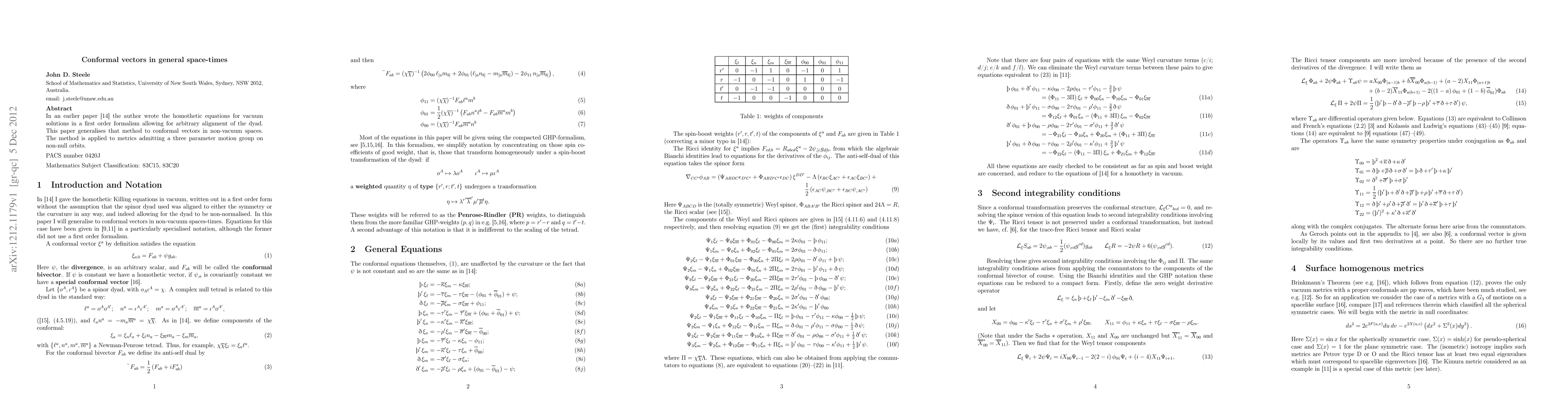 In an earlier paper (Class. Quantum Grav. 19 (2002) p.259) the author wrote the homothetic equations for vacuum solutions in a first order formalism allowing for arbitrary alignment of the dyad. This paper generalises that method to conformal vectors in non-vacuum spaces. The method is applied to metrics admitting a three parameter motion group on non-null orbits.