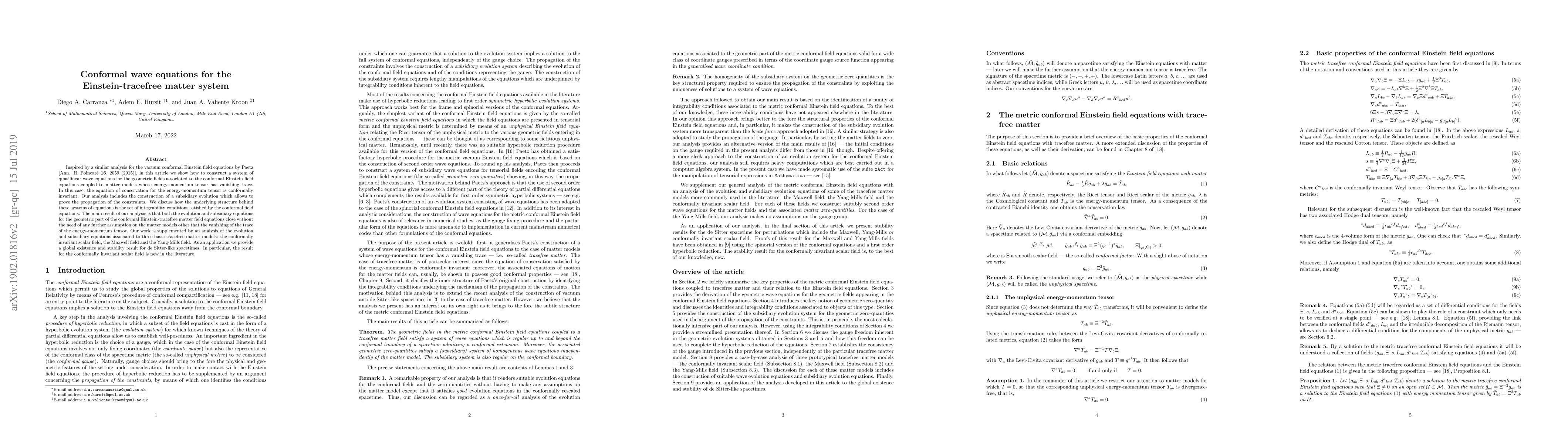 This paper constructs quasilinear wave equations for geometric fields in the conformal Einstein field equations coupled with tracefree matter models. It demonstrates the closure of evolution and subsidiary equations without additional assumptions beyond tracefreeness, and provides a global existence and stability result for de Sitter-like spacetimes, particularly for the conformally coupled scalar field.