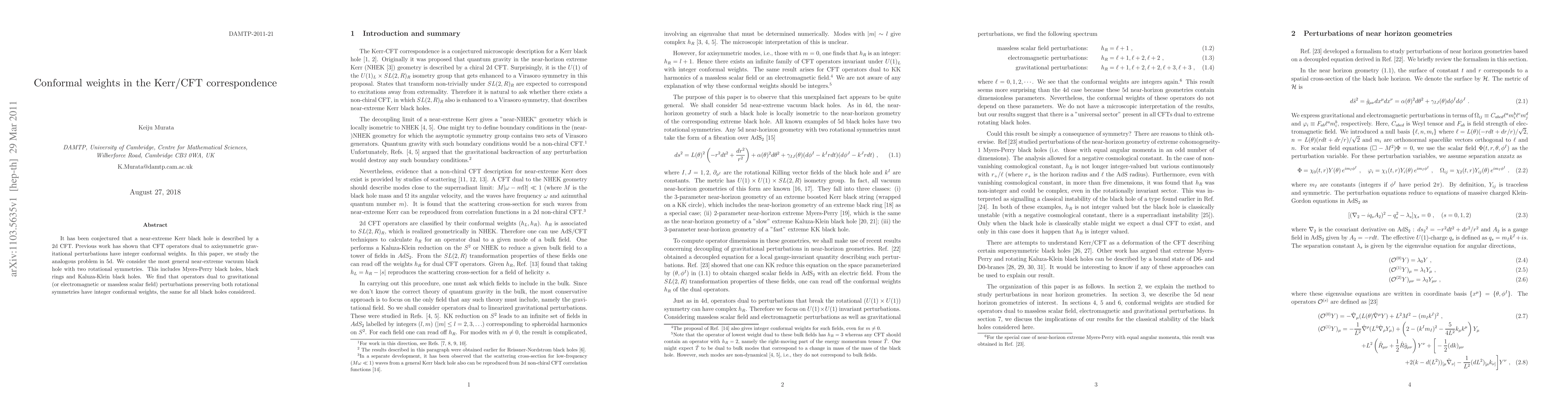 This paper investigates the conformal weights of operators in a 2d CFT conjectured to describe near-extreme Kerr black holes, extending the analysis to 5d. It finds that perturbations preserving two rotational symmetries in various black holes, including Myers-Perry, black rings, and Kaluza-Klein black holes, have integer conformal weights.