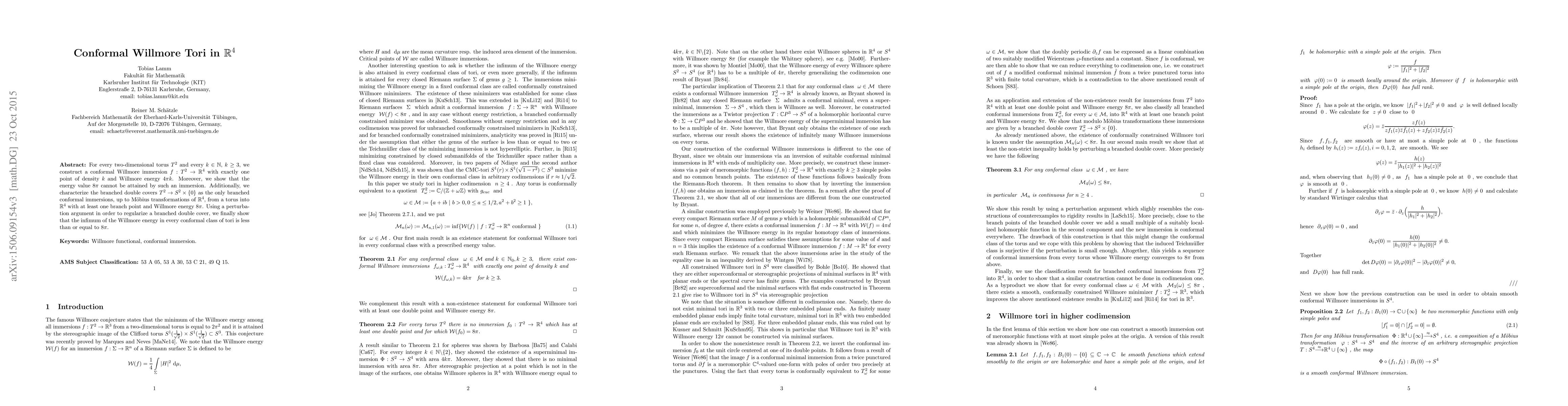 This paper constructs conformal Willmore immersions of tori in $\mathbb{R}^4$ with a single point of density $k$ and Willmore energy $4\pi k$, proving that $8\pi$ cannot be achieved. It also characterizes branched double covers as the only conformal immersions of tori into $\mathbb{R}^4$ with at least one branch point and Willmore energy $8\pi$.