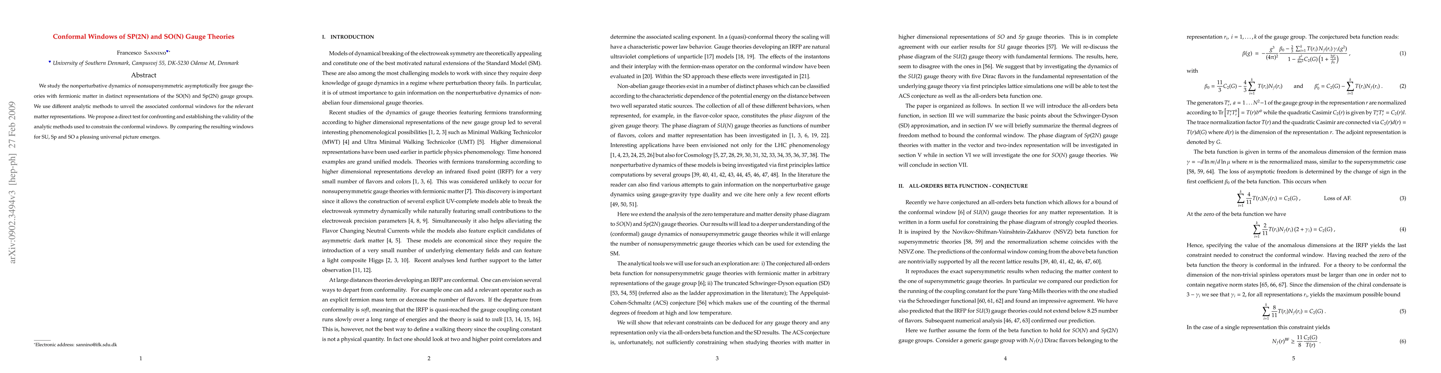 This research investigates the nonperturbative dynamics of nonsupersymmetric gauge theories with fermionic matter in SO(N) and Sp(2N) gauge groups, using various analytic methods to determine their conformal windows. It proposes a direct test to validate these methods, revealing a universal picture when comparing results across SU, Sp, and SO groups.