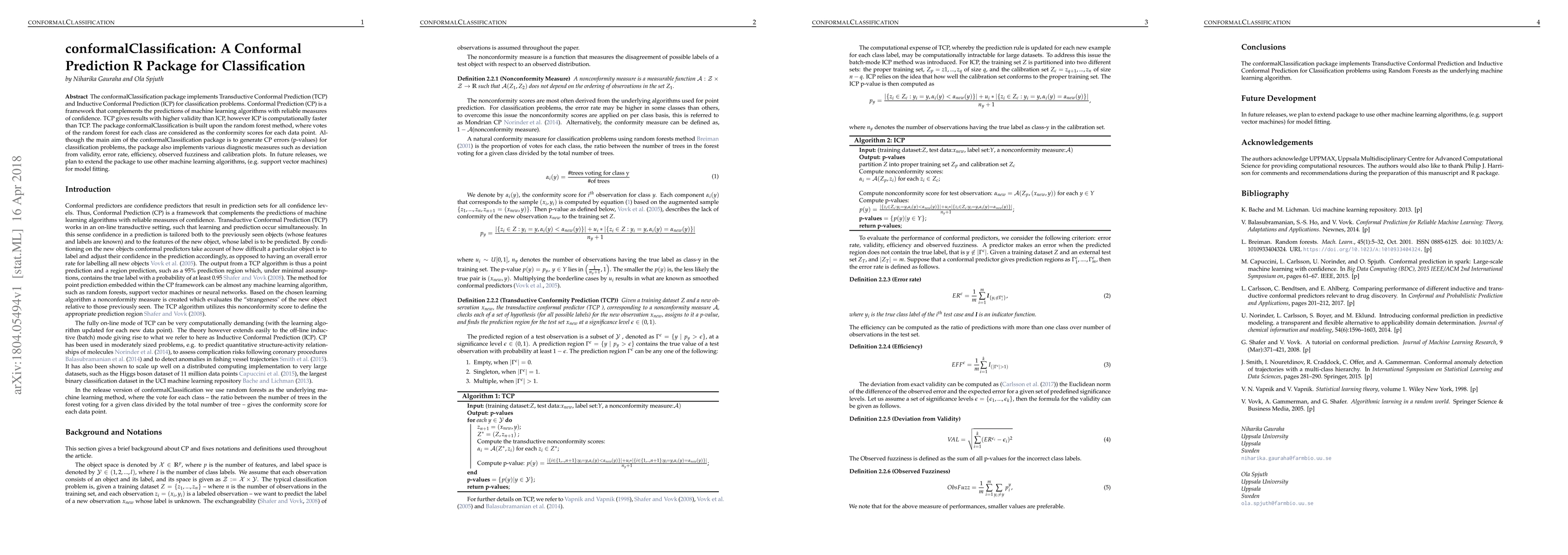 The conformalClassification package implements Transductive and Inductive Conformal Prediction for classification, enhancing machine learning predictions with confidence measures. Built on random forest votes, it also provides diagnostic tools for model validation and future plans include extending support to other algorithms.