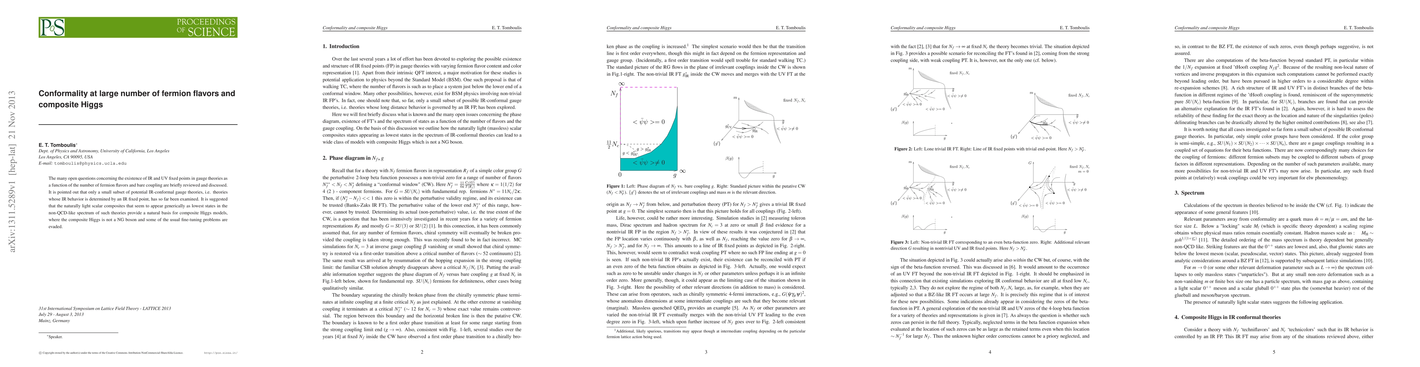 This paper reviews the existence of infrared and ultraviolet fixed points in gauge theories with varying fermion flavors, focusing on the subset of infrared-conformal theories. It proposes that light scalar composites in non-QCD-like spectra can serve as a foundation for composite Higgs models, avoiding typical fine-tuning issues.