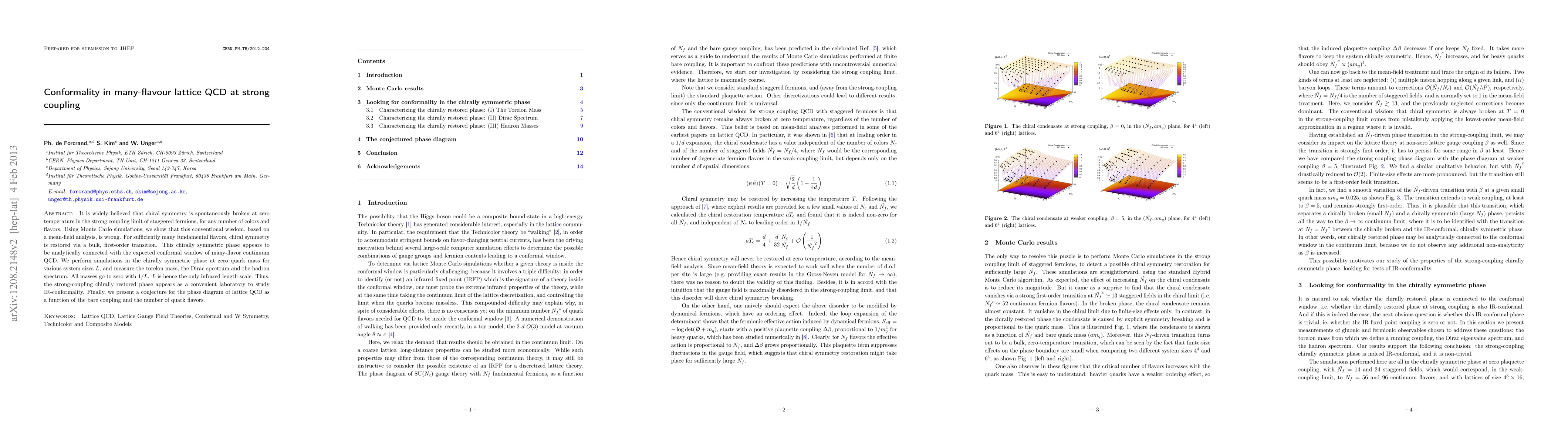 It is widely believed that chiral symmetry is spontaneously broken at zero temperature in the strong coupling limit of staggered fermions, for any number of colors and flavors. Using Monte Carlo simulations, we show that this conventional wisdom, based on a mean-field analysis, is wrong. For sufficiently many fundamental flavors, chiral symmetry is restored via a bulk, first-order transition. This chirally symmetric phase appears to be analytically connected with the expected conformal window of many-flavor continuum QCD. We perform simulations in the chirally symmetric phase at zero quark mass for various system sizes L, and measure the torelon mass, the Dirac spectrum and the hadron spectrum. All masses go to zero with 1/L. L is hence the only infrared length scale. Thus, the strong-coupling chirally restored phase appears as a convenient laboratory to study IR-conformality. Finally, we present a conjecture for the phase diagram of lattice QCD as a function of the bare coupling and the number of quark flavors.