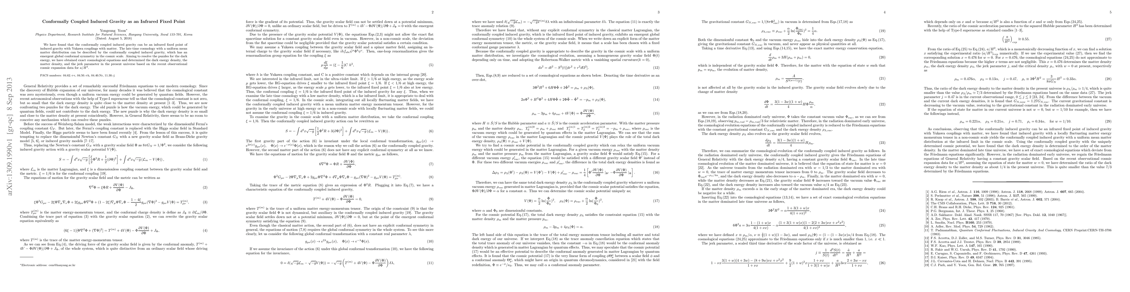 This paper identifies conformally coupled induced gravity as an infrared fixed point, suggesting it can describe late-time cosmology with a uniform matter distribution. It resolves dark energy puzzles by deriving exact cosmological equations and determining the dark energy density, matter density, and jerk parameter using recent observational data.