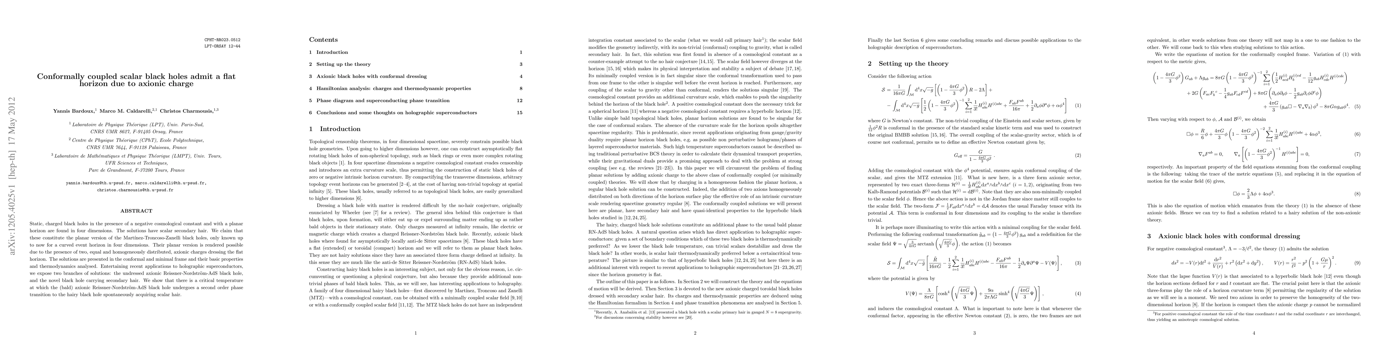 Static, charged black holes in the presence of a negative cosmological constant and with a planar horizon are found in four dimensions. The solutions have scalar secondary hair. We claim that these constitute the planar version of the Martinez-Troncoso-Zanelli black holes, only known up to now for a curved event horizon in four dimensions. Their planar version is rendered possible due to the presence of two, equal and homogeneously distributed, axionic charges dressing the flat horizon. The solutions are presented in the conformal and minimal frame and their basic properties and thermodynamics analysed. Entertaining recent applications to holographic superconductors, we expose two branches of solutions: the undressed axionic Reissner-Nordstrom-AdS black hole, and the novel black hole carrying secondary hair. We show that there is a critical temperature at which the (bald) axionic Reissner-Nordstrom-AdS black hole undergoes a second order phase transition to the hairy black hole spontaneously acquiring scalar hair.