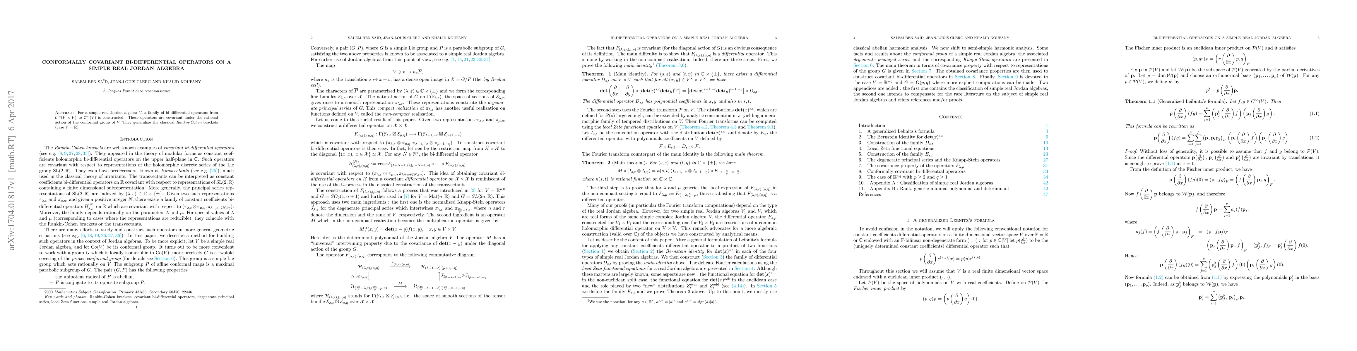 This paper constructs a family of conformally covariant bi-differential operators on a simple real Jordan algebra $V$, generalizing the Rankin-Cohen brackets, and demonstrates their covariance under the rational action of the conformal group of $V$.