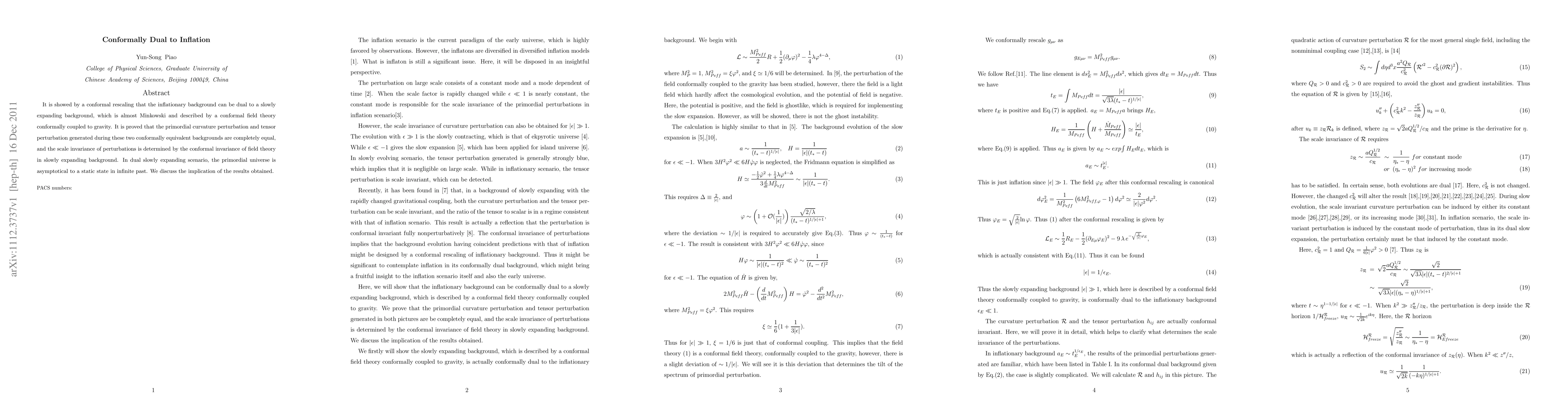 It is showed by a conformal rescaling that the inflationary background can be dual to a slowly expanding background, which is almost Minkowski and described by a conformal field theory conformally coupled to gravity. It is proved that the primordial curvature perturbation and tensor perturbation generated during these two conformally equivalent backgrounds are completely equal, and the scale invariance of perturbations is determined by the conformal invariance of field theory in slowly expanding background. In dual slowly expanding scenario, the primordial universe is asymptotical to a static state in infinite past. We discuss the implication of the results obtained.