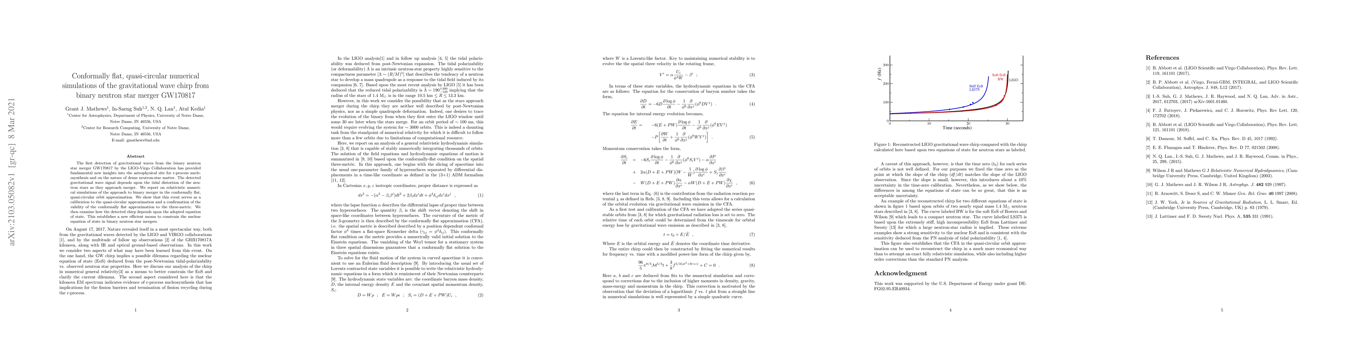 This paper presents relativistic numerical simulations of the gravitational wave chirp from the binary neutron star merger GW170817, confirming the validity of the conformally flat, quasi-circular orbit approximation and establishing a new method to constrain the nuclear equation of state based on the detected signal.