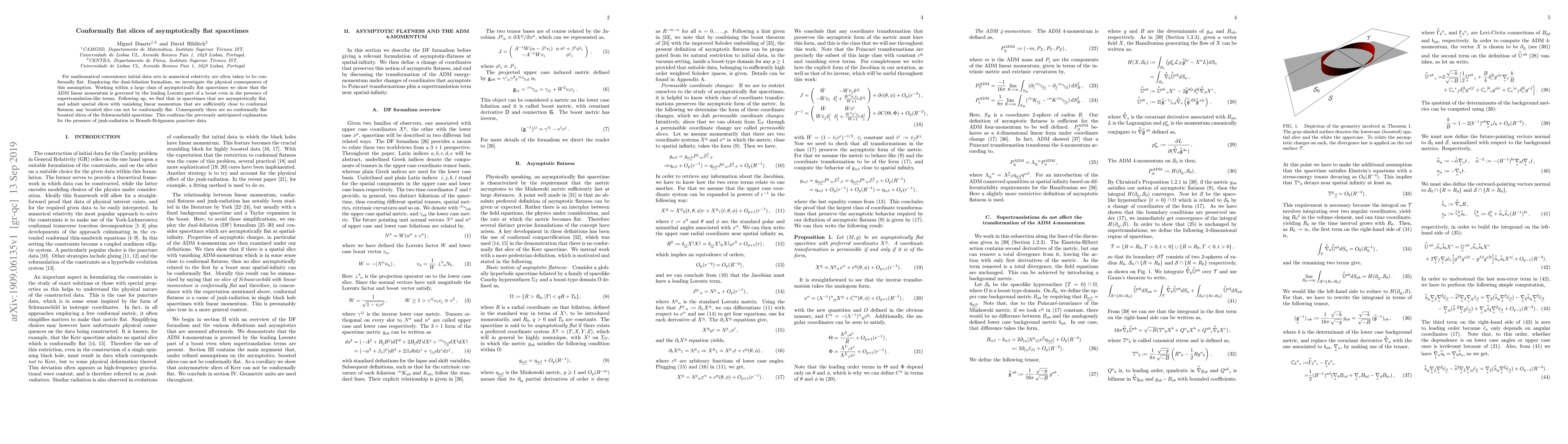 For mathematical convenience initial data sets in numerical relativity are often taken to be conformally flat. Employing the dual-foliation formalism, we investigate the physical consequences of this assumption. Working within a large class of asymptotically flat spacetimes we show that the ADM linear momentum is governed by the leading Lorentz part of a boost even in the presence of supertranslation-like terms. Following up, we find that in spacetimes that are asymptotically flat, and admit spatial slices with vanishing linear momentum that are sufficiently close to conformal flatness, any boosted slice can not be conformally flat. Consequently there are no conformally flat boosted slices of the Schwarzschild spacetime. This confirms the previously anticipated explanation for the presence of junk-radiation in Brandt-Bruegmann puncture data.