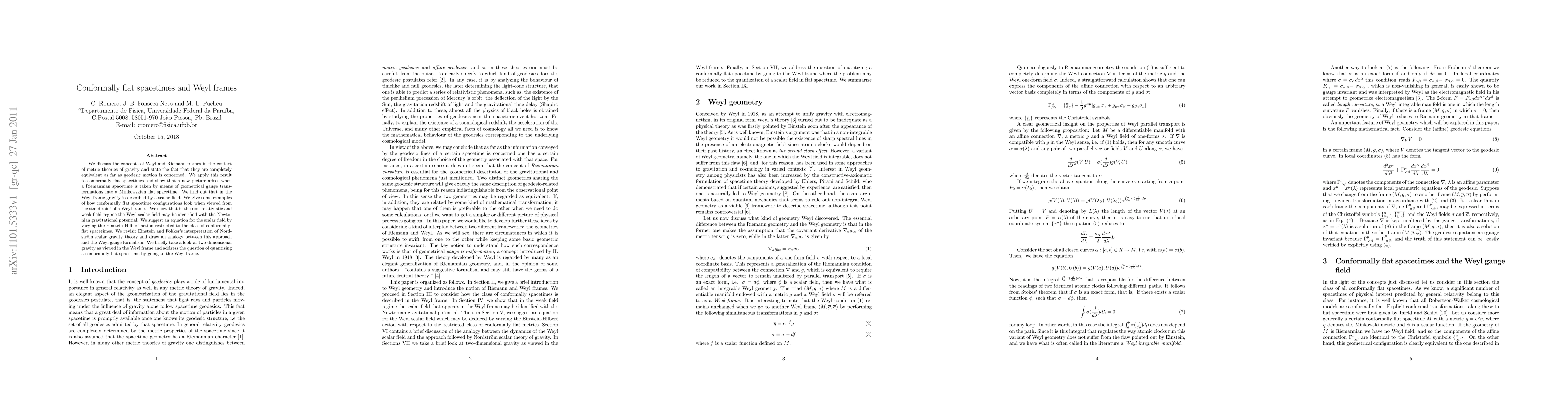 We discuss the concepts of Weyl and Riemann frames in the context of metric theories of gravity and state the fact that they are completely equivalent as far as geodesic motion is concerned. We apply this result to conformally flat spacetimes and show that a new picture arises when a Riemannian spacetime is taken by means of geometrical gauge transformations into a Minkowskian flat spacetime. We find out that in the Weyl frame gravity is described by a scalar field. We give some examples of how conformally flat spacetime configurations look when viewed from the standpoint of a Weyl frame. We show that in the non-relativistic and weak field regime the Weyl scalar field may be identified with the Newtonian gravitational potential. We suggest an equation for the scalar field by varying the Einstein-Hilbert action restricted to the class of conformally-flat spacetimes. We revisit Einstein and Fokker's interpretation of Nordstr\"om scalar gravity theory and draw an analogy between this approach and the Weyl gauge formalism. We briefly take a look at two-dimensional gravity as viewed in the Weyl frame and address the question of quantizing a conformally flat spacetime by going to the Weyl frame.