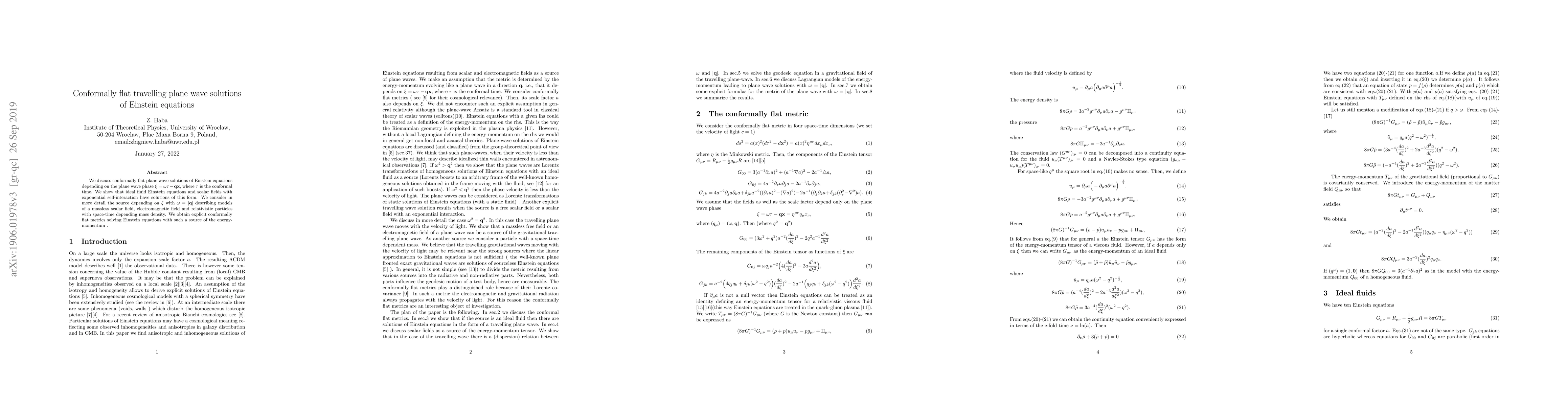 We discuss conformally flat plane wave solutions of Einstein equations depending on the plane wave phase $\xi=\omega\tau-{\bf qx}$, where $\tau$ is the conformal time. We show that ideal fluid Einstein equations and scalar fields with exponential self-interaction have solutions of this form. We consider in more detail the source depending on $\xi$ with $\omega=\vert{\bf q}\vert$ describing models of a massless scalar field, electromagnetic field and relativistic particles with space-time depending mass density. We obtain explicit conformally flat metrics solving Einstein equations with such a source of the energy-momentum.