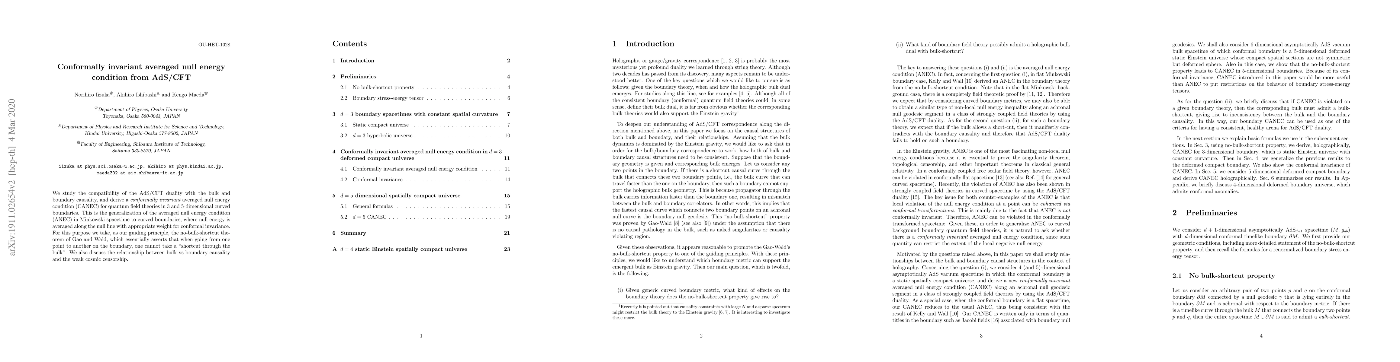 We study the compatibility of the AdS/CFT duality with the bulk and boundary causality, and derive a conformally invariant averaged null energy condition (CANEC) for quantum field theories in 3 and 5-dimensional curved boundaries. This is the generalization of the averaged null energy condition (ANEC) in Minkowski spacetime to curved boundaries, where null energy is averaged along the null line with appropriate weight for conformal invariance. For this purpose we take, as our guiding principle, the no-bulk-shortcut theorem of Gao and Wald, which essentially asserts that when going from one point to another on the boundary, one cannot take a "shortcut through the bulk". We also discuss the relationship between bulk vs boundary causality and the weak cosmic censorship.