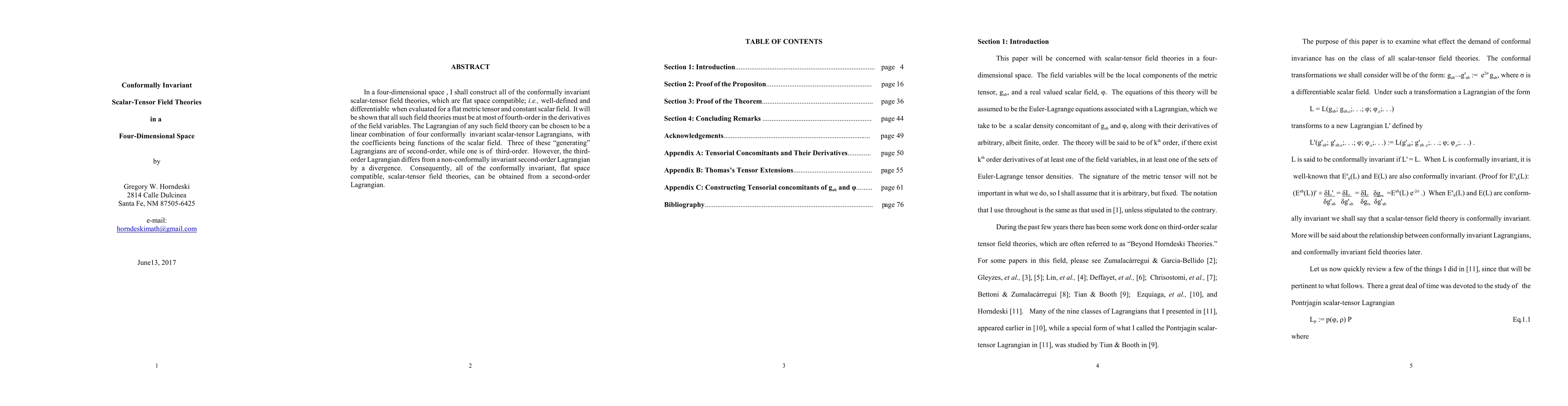 In a four-dimensional space, I shall construct all of the conformally invariant scalar-tensor field theories, which are flat space compatible; i.e., well-defined and differentiable when evaluated for a flat metric tensor and constant scalar field. It will be shown that all such field theories must be at most of fourth-order in the derivatives of the field variables. The Lagrangian of any such field theory can be chosen to be a linear combination of four conformally invariant scalar-tensor Lagrangians, with the coefficients being functions of the scalar field. Three of these "generating" Lagrangians are of second-order, while one of of third-order. However, the third-order Lagrangian differs from a non-conformally invariant second-order Lagrangian by a divergence. Consequently, all of the conformally invariant, flat space compatible, scalar-tensor field theories, can be obtained from a second-order Lagrangian.