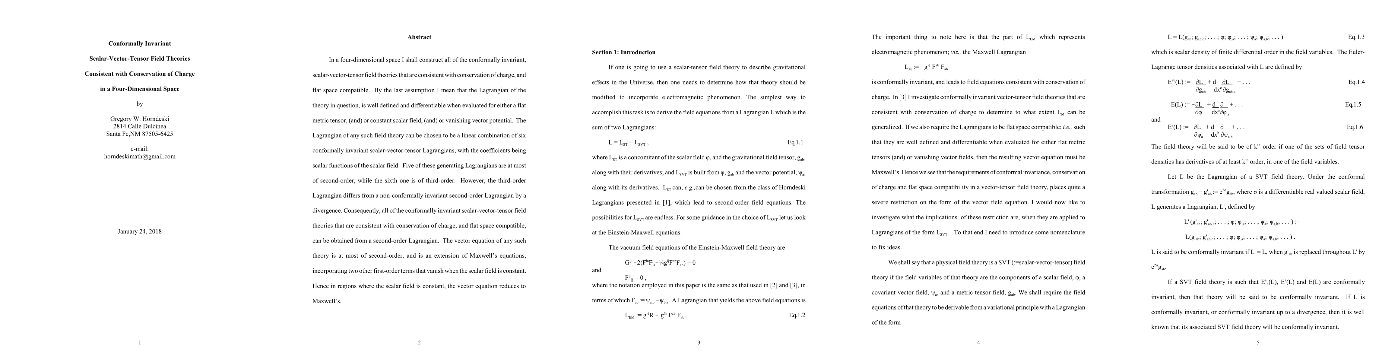 In a four-dimensional space I shall construct all of the conformally invariant, scalar-vector-tensor field theories that are consistent with conservation of charge, and flat space compatible. By the last assumption I mean that the Lagrangian of the theory in question is well defined and differentiable when evaluated for either a flat metric tensor, (and) or constant scalar field, (and) or vanishing vector potential. The Lagrangian of any such field theory can be chosen to be a linear combination of six conformally invariant scalar-vector-tensor Lagrangians, with the coefficients being scalar functions of the scalar field. Five of these generating Lagrangians are at most of second-order, while the sixth one is of third-order. However, the third-order Lagrangian differs from a non-conformally invariant second-order Lagrangian by a divergence. Consequently, all of the conformally invariant scalar-vector-tensor field theories that are consistent with conservation of charge, and flat space compatible, can be obtained from a second-order Lagrangian. The vector equation of any such theory is at most of second-order, and is an extension of Maxwell's equations, incorporating two other first-order terms that vanish when the scalar field is constant. Hence in regions where the scalar field is constant, the vector equation reduces to Maxwell's.