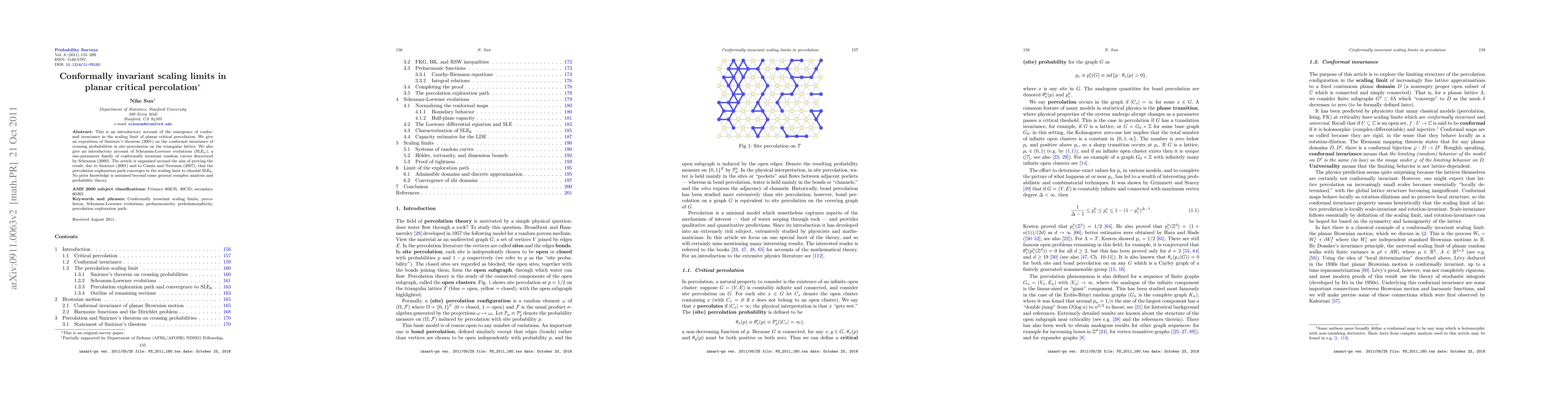 The paper provides an introductory account of conformal invariance in the scaling limit of planar critical percolation, focusing on Smirnov's theorem (2001) on the conformal invariance of crossing probabilities in site percolation on the triangular lattice and introducing Schramm-Loewner evolutions (SLE(k)) as a one-parameter family of conformally invariant random curves.