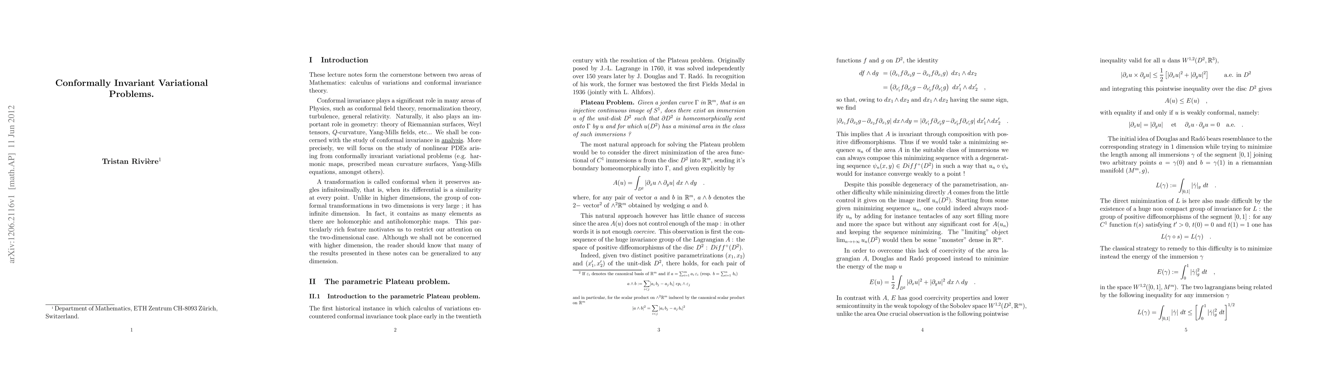 Conformal invariance plays a significant role in many areas of Physics, such as conformal field theory, renormalization theory, turbulence, general relativity. Naturally, it also plays an important role in geometry: theory of Riemannian surfaces, Weyl tensors, $Q$-curvature, Yang-Mills fields, etc... We shall be concerned with the study of conformal invariance in analysis. More precisely, we will focus on the study of nonlinear PDEs arising from conformally invariant two dimensional variational problems (e.g. harmonic maps, prescribed mean curvature surfaces, Willmore and Constrained conformal surfaces, isothermic surfaces). The present manuscript are lecture notes of courses given by the author at several places including UBC Vancouver, SNS Pisa, IHP Paris, ICTP Trieste.