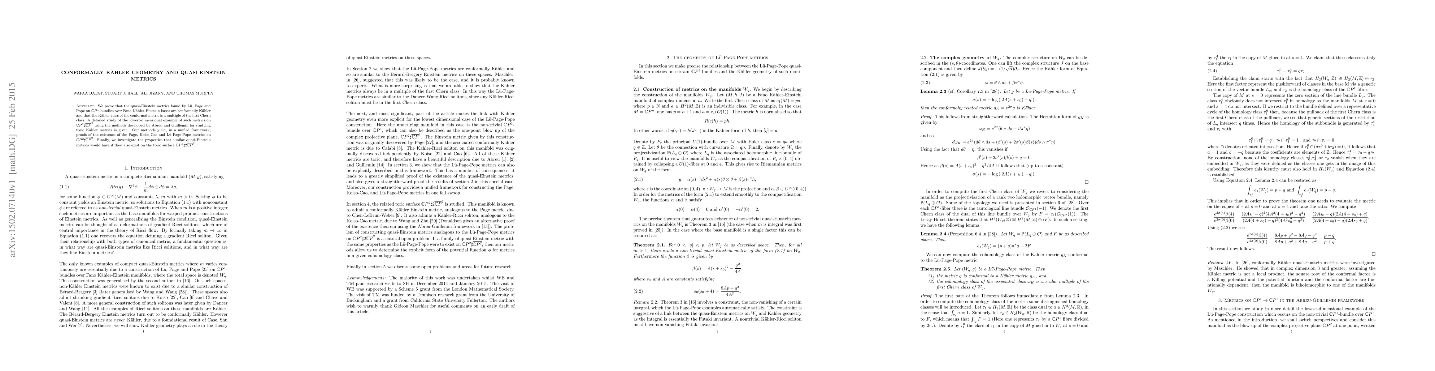 We prove that the quasi-Einstein metrics found by L\"u, Page and Pope on $\mathbb{C}P^{1}$-bundles over Fano K\"ahler-Einstein bases are conformally K\"ahler and that the K\"ahler class of the conformal metric is a multiple of the first Chern class. A detailed study of the lowest-dimensional example of such metrics on $\mathbb{C}P^{2}\sharp \overline{\mathbb{C}P}^{2}$ using the methods developed by Abreu and Guillemin for studying toric K\"ahler metrics is given. Our methods yield, in a unified framework, proofs of the existence of the Page, Koiso-Cao and L\"u-Page-Pope metrics on $\mathbb{C}P^{2}\sharp \overline{\mathbb{C}P}^{2}$. Finally, we investigate the properties that similar quasi-Einstein metrics would have if they also exist on the toric surface $\mathbb{C}P^{2}\sharp 2 \overline{\mathbb{C}P}^{2}$.
