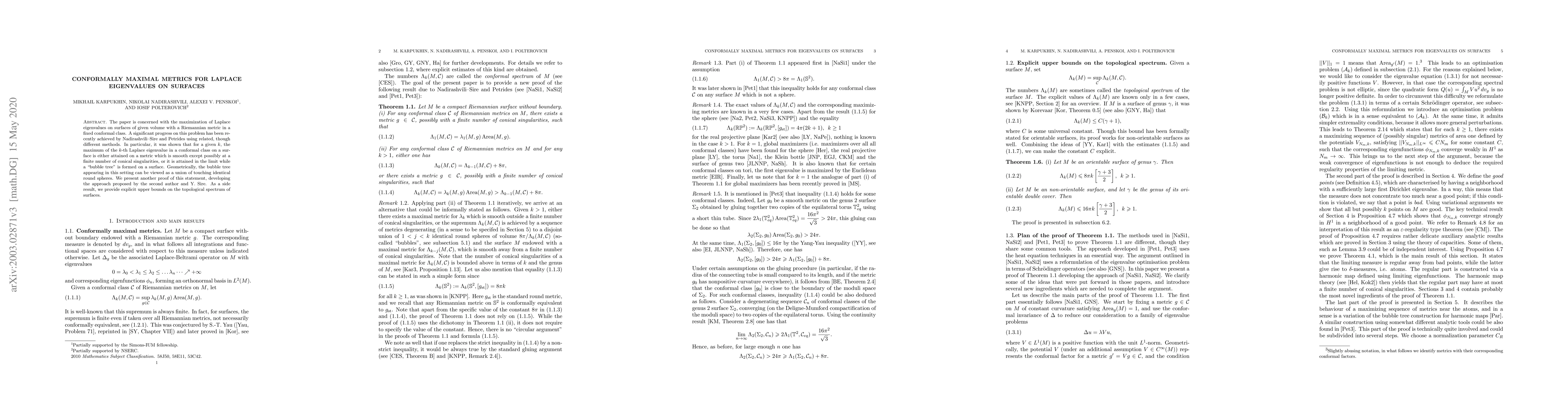 This paper presents an alternative proof for the maximization of Laplace eigenvalues on surfaces within a fixed conformal class, showing that the maximum is either achieved by metrics with conical singularities or through the formation of a "bubble tree" of touching identical round spheres. Additionally, it provides explicit upper bounds on the topological spectrum of surfaces.