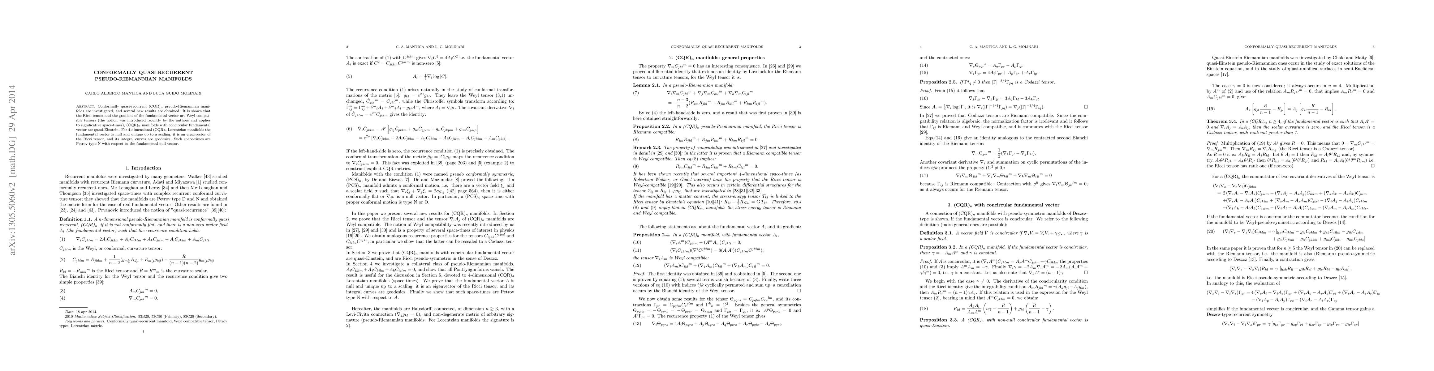 This paper investigates conformally quasi-recurrent pseudo-Riemannian manifolds, proving that the Ricci tensor and gradient of the fundamental vector are Weyl compatible tensors. It further establishes that (CQR)_n manifolds with concircular fundamental vector are quasi-Einstein, particularly noting unique properties in 4-dimensional Lorentzian (CQR)_4 manifolds where the fundamental null vector is an eigenvector of the Ricci tensor and its geodesic integral curves.