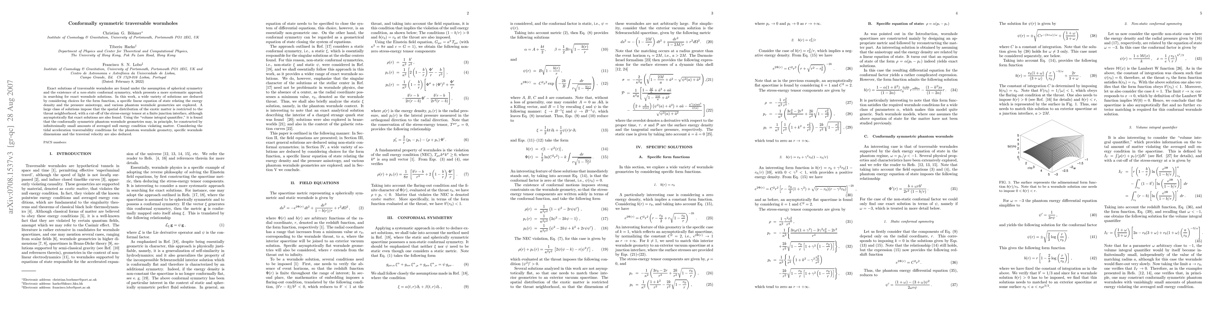 This paper explores exact solutions for traversable wormholes under spherical symmetry and non-static conformal symmetry, finding a variety of solutions through different form functions and phantom geometries. It concludes that these wormholes can be constructed using minimal amounts of exotic matter violating the averaged null energy condition, with specific dimensions and traversal velocities deduced for traversability.